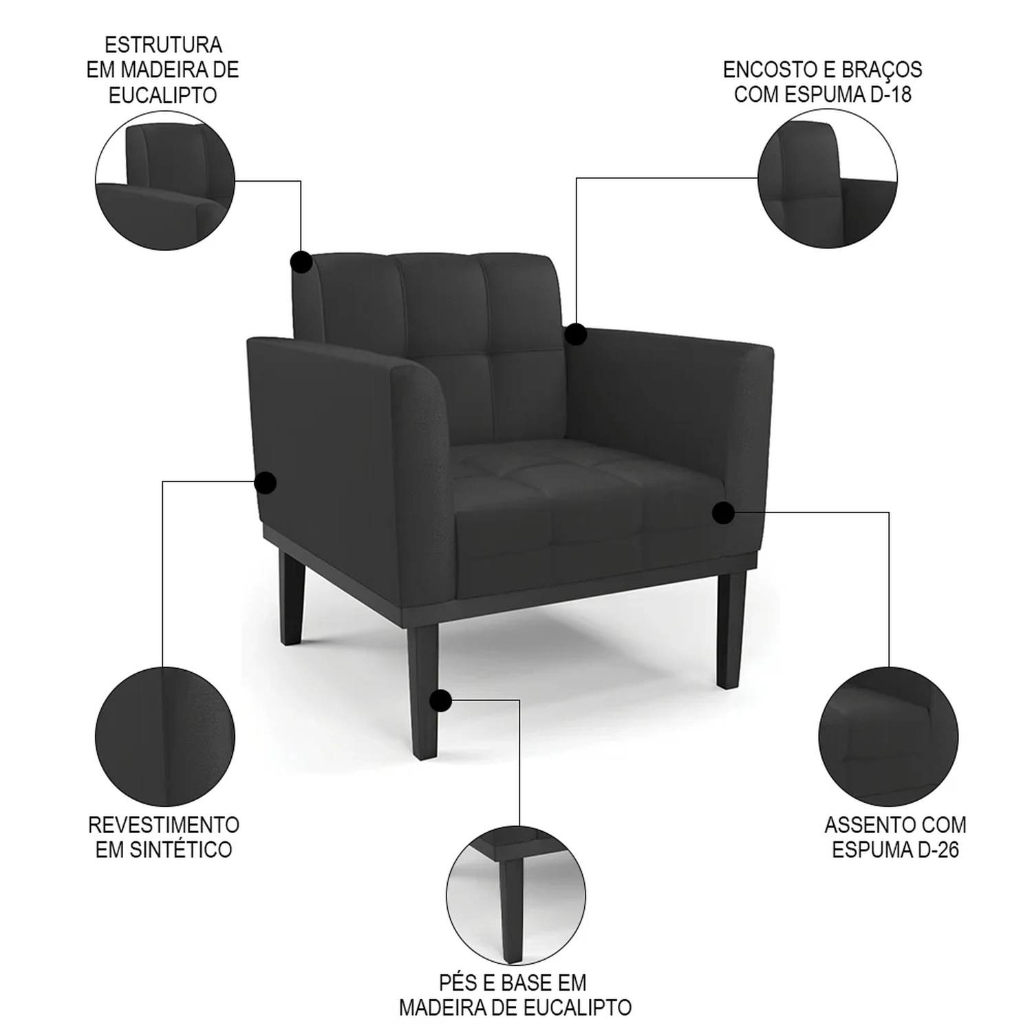 Você está procurando uma poltrona que combine com a sua Sala De Estar, recepção ou seu quarto, que ofereça conforto e qualidade? Então você vai adorar a Poltrona Decorativa Base Madeira Preto Ana Sintético Preto, da Ibiza!