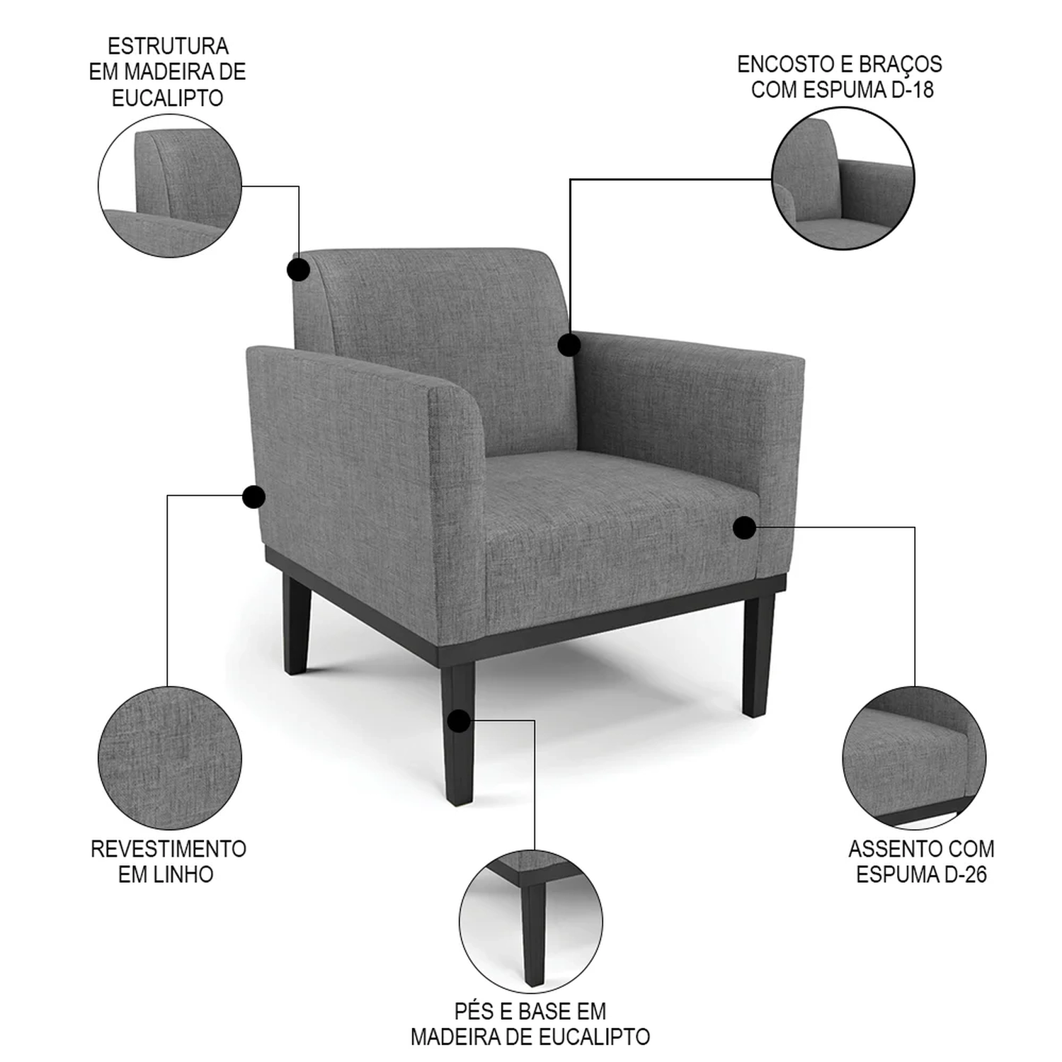Você está procurando uma poltrona que combine com a sua Sala De Estar, recepção ou seu quarto, que ofereça conforto e qualidade? Então você vai adorar a Poltrona Decorativa Base Madeira Preto Maressa Linho Grafite, da Ibiza!