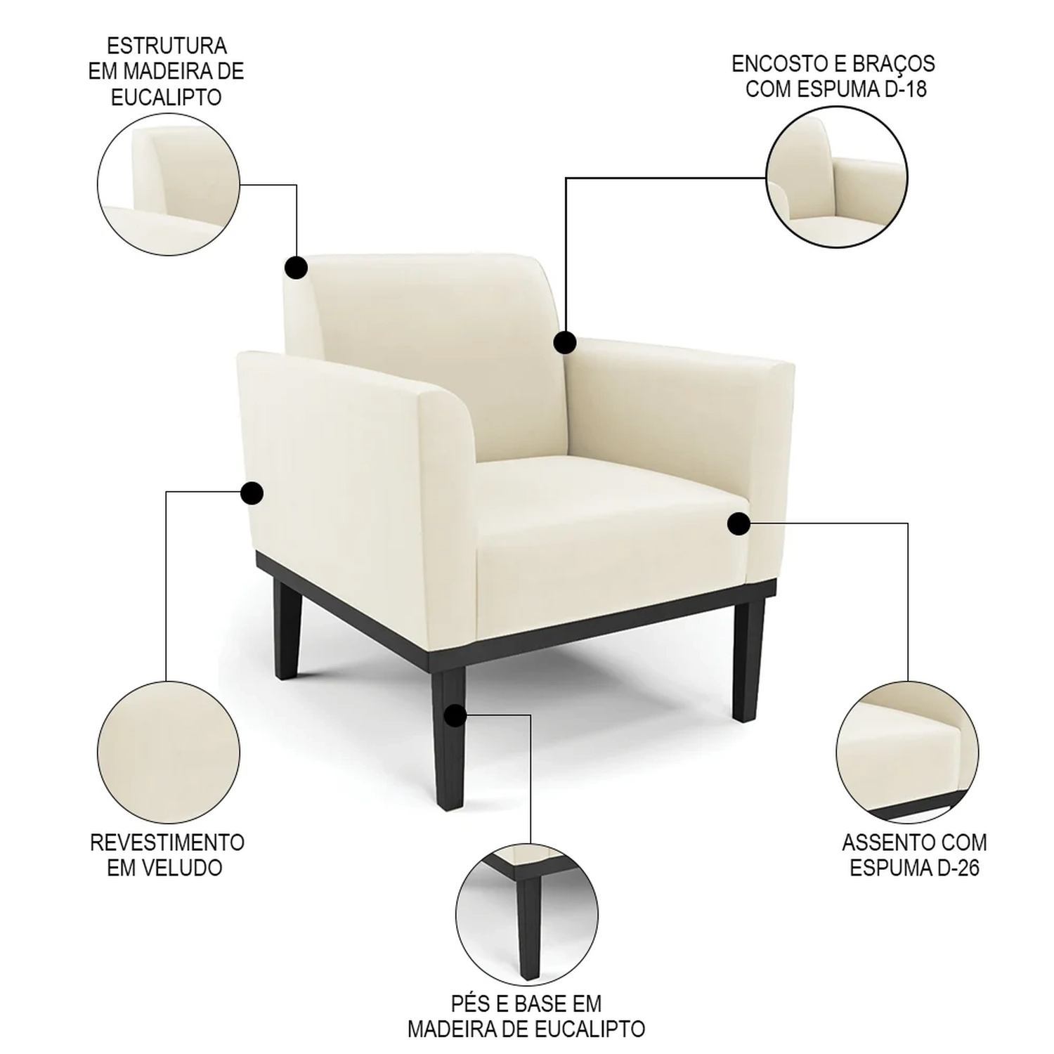 Material da Espuma: Assento D-26/ Encosto e braços D-18.