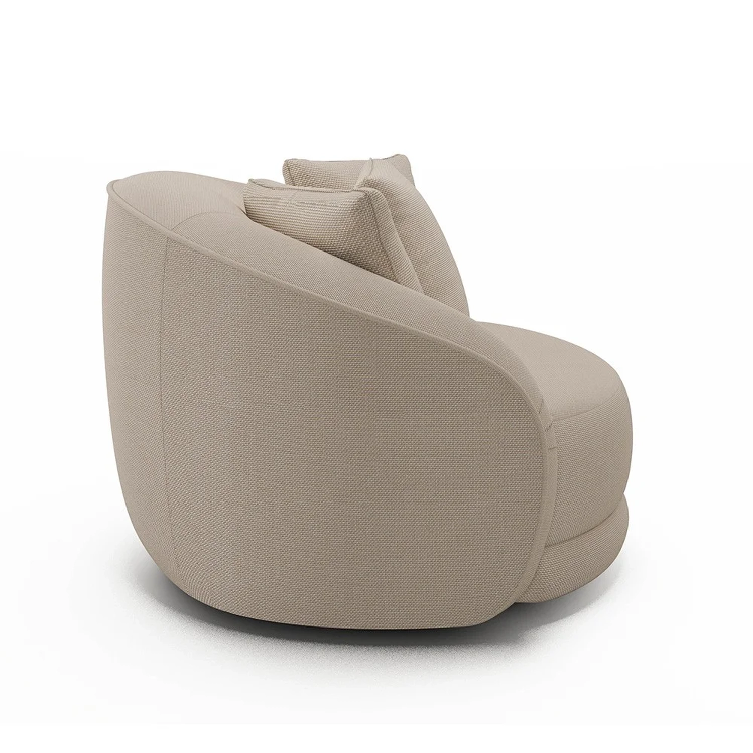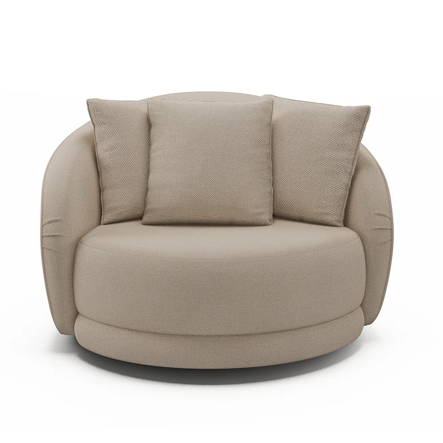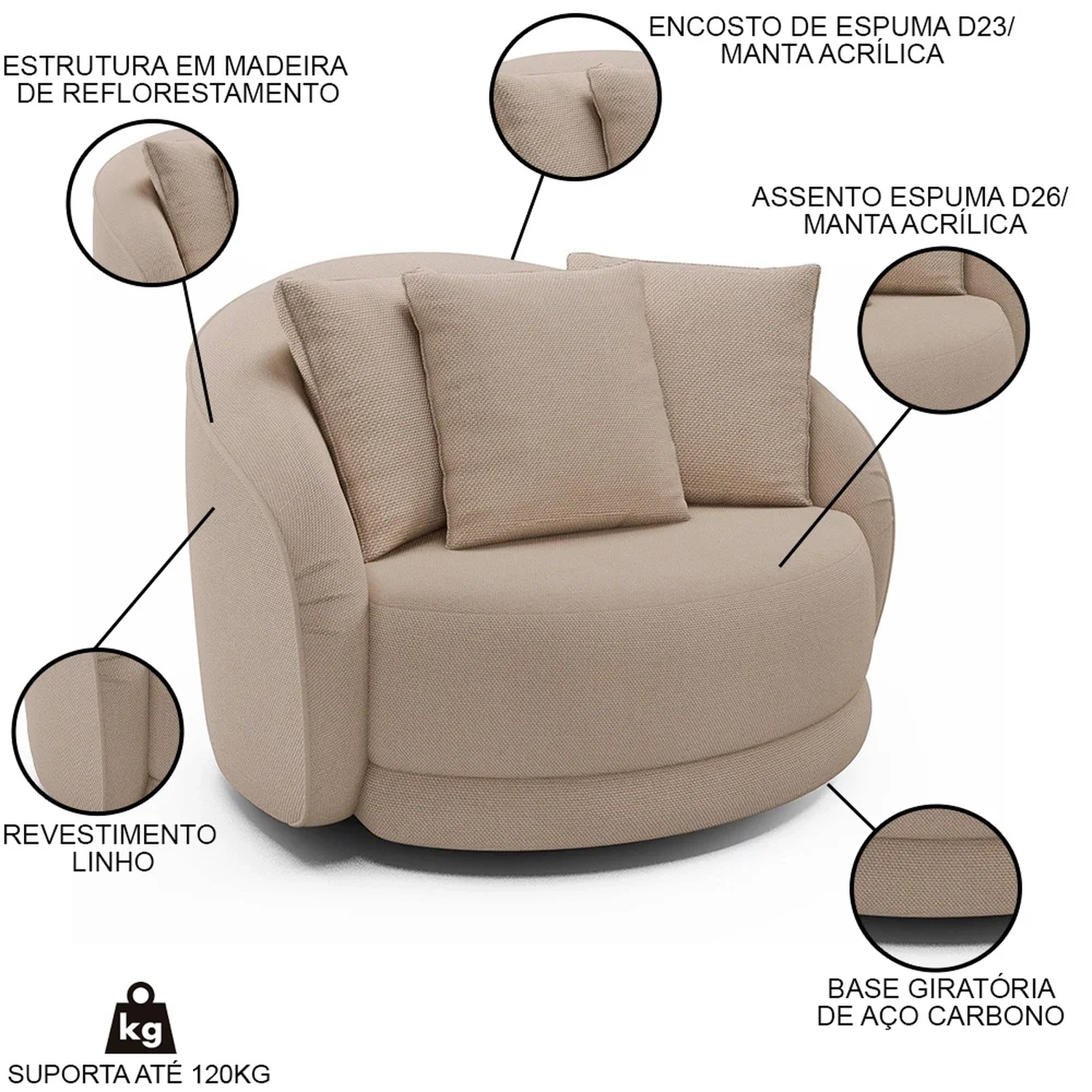 O design redondo com almofadas soltas faz com que essa poltrona moderna complemente a decoração da sua sala de estar, além de oferecer o máximo de aconchego, dando a sensação de estar sendo abraçado por ela. E tudo isso, graças à estrutura robusta com madeira maciça imunizada contra mofo, cupim e micro-organismo. Já a maciez do estofado fica por conta das espumas de alta densidade, reforçadas com cintas elásticas de alta resistência. Para completar, base giratória agrega muito mais funcionalidade e, ainda, dá aquele toque de charme.