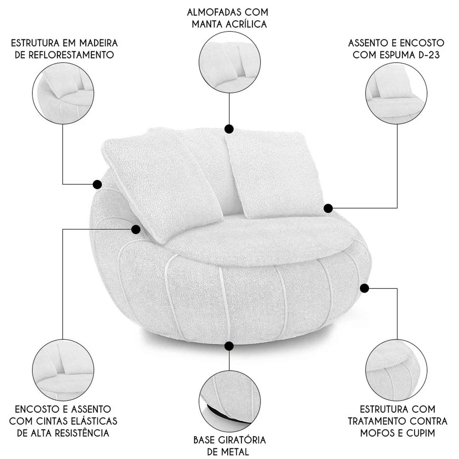 Com design contemporâneo, visando o conforto e a estética, a Poltrona Decorativa Redonda Giratória com Almofadas Saphire Z32 Boucle Branco, da Mpozenato vai compor os mais diversos ambientes, desde uma Sala De Estar, a um quarto ou lounge.