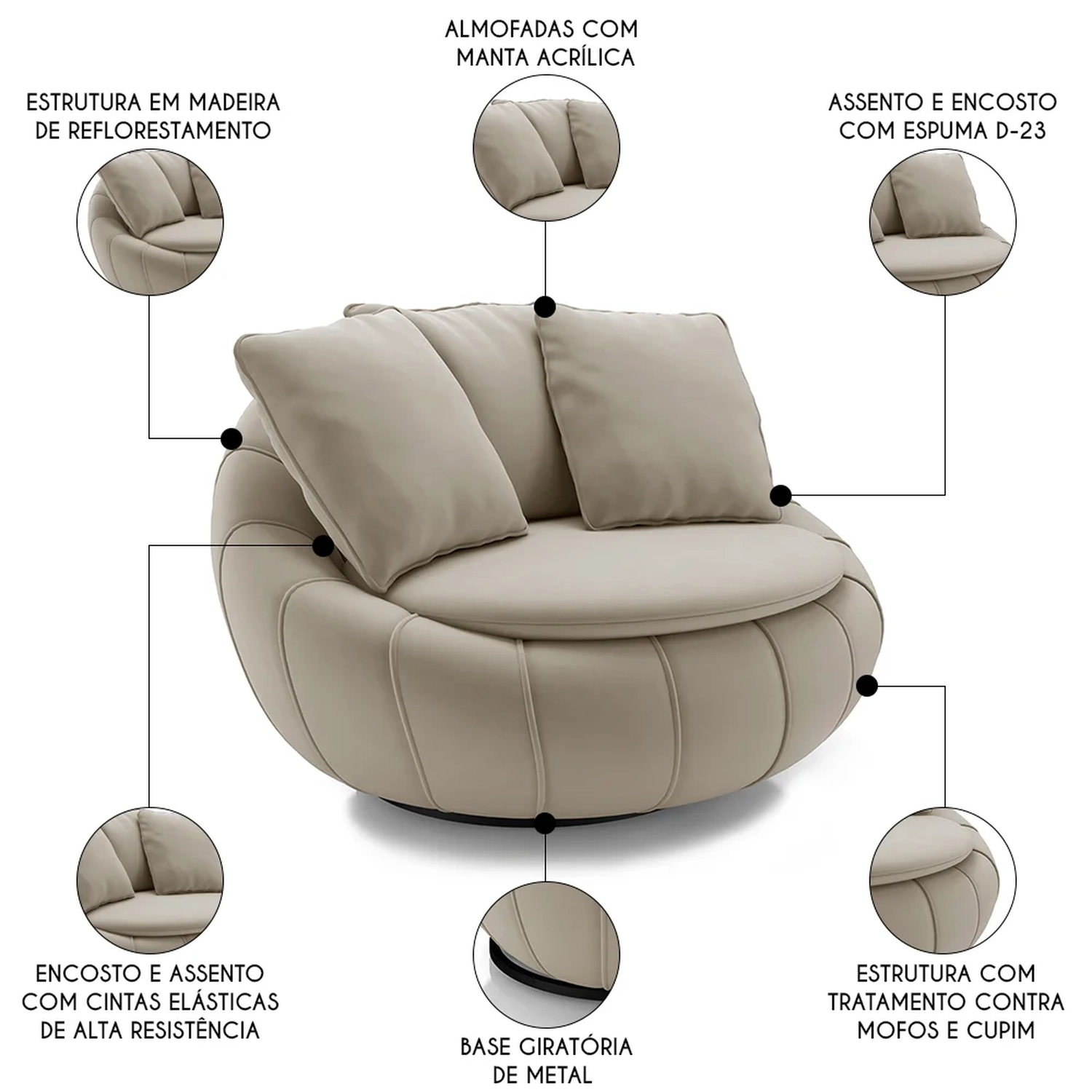 Não apenas pela beleza que salta aos olhos, mas pelo conforto e aconchego que oferece. Imagine-se chegando em casa após um longo dia de trabalho e se entregando ao repouso nessa poltrona dos sonhos. O assento acolhedor e as 3 almofadas com espumas de alta densidade D23 e manta acrílica envolve você em uma experiência de bem-estar sem igual, onde o difícil realmente será querer levantar. Não é apenas uma poltrona, é um refúgio particular. A Poltrona Redonda não é só sinônimo de estilo, mas também de um descanso sublime que você merece. Então, o que mais está esperando para transformar seu espaço e sua rotina com essa experiência incrível?!