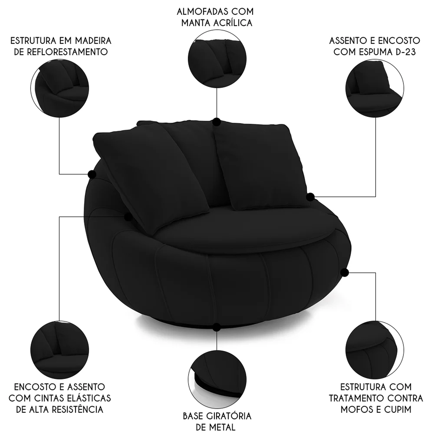 Com design contemporâneo, visando o conforto e a estética, a Poltrona Decorativa Redonda Giratória com Almofadas Saphire Z32 Veludo Preto, da Mpozenato vai compor os mais diversos ambientes, desde uma Sala De Estar, a um quarto ou lounge.