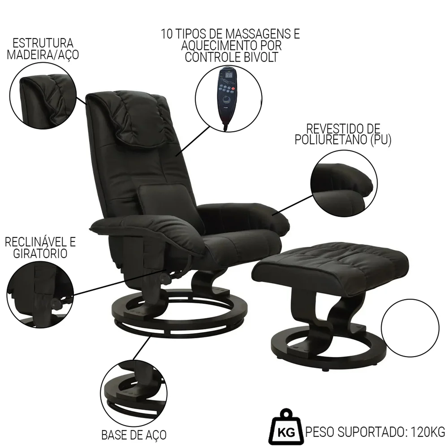 - Poltrona reclinável e giratória com função aquecimento.