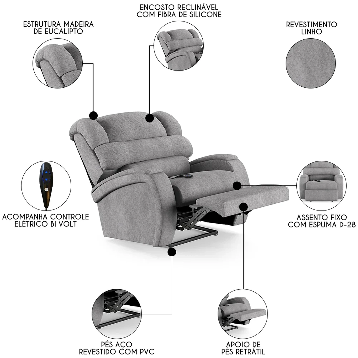 Imagine transformar sua Sala De Estar em um espaço de entretenimento de última geração com a Poltrona do Papai Reclinável Kalie Controle Power Elétrico FH9 Linho Cinza, da Mpozenato!