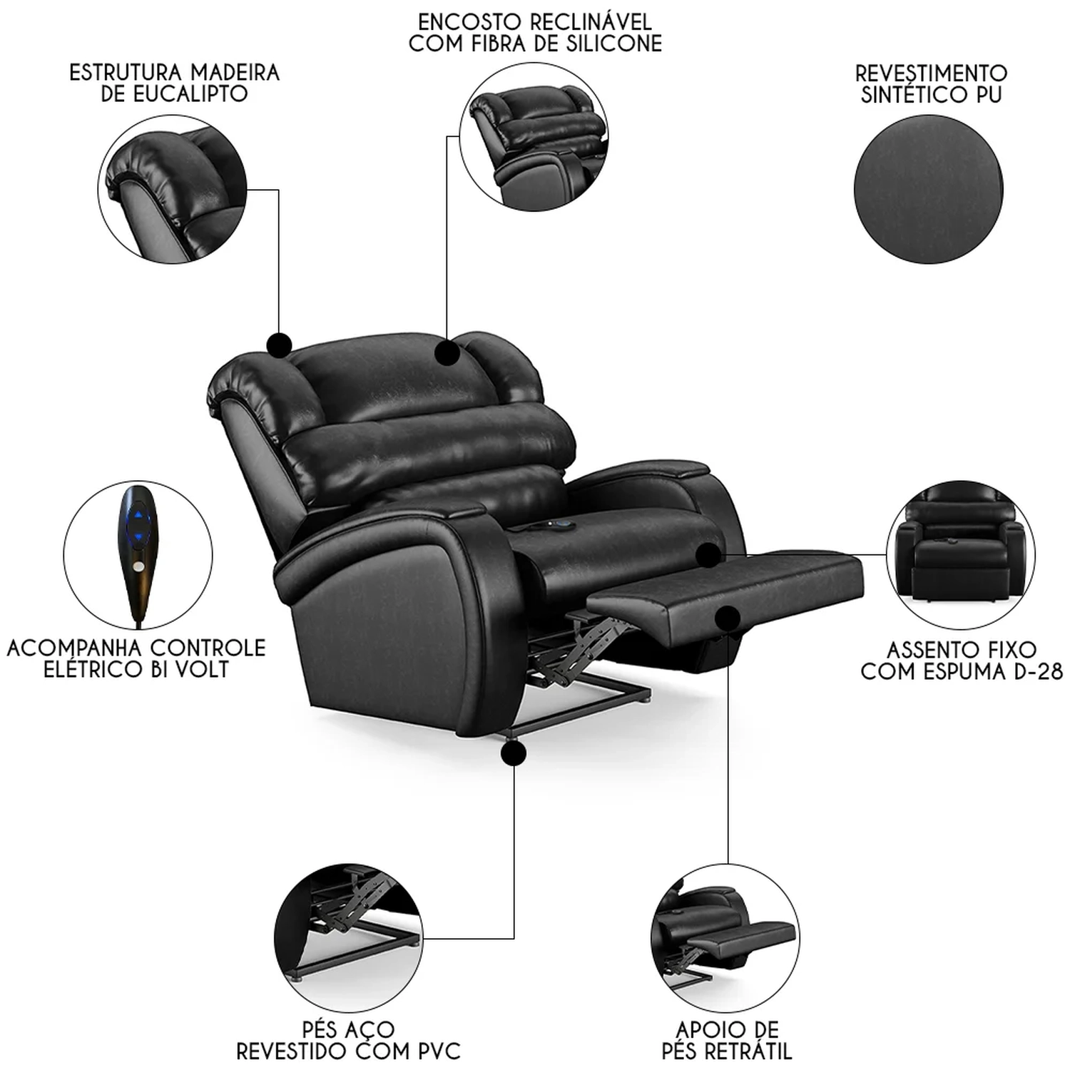 Imagine transformar sua Sala De Estar em um espaço de entretenimento de última geração com a Poltrona do Papai Reclinável Kalie Controle Power Elétrico FH9 PU Preto Brilho, da Mpozenato!