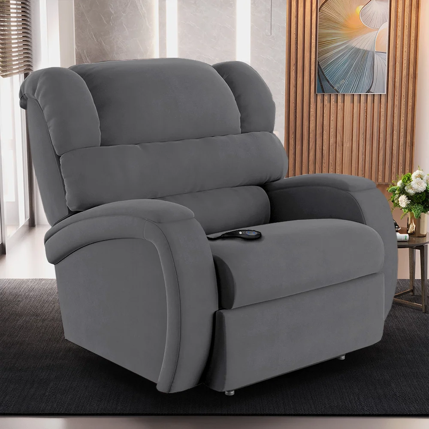 Imagine transformar sua Sala De Estar em um espaço de entretenimento de última geração com a Poltrona do Papai Reclinável Kalie Controle Power Elétrico FH9 Veludo Cinza, da Mpozenato!