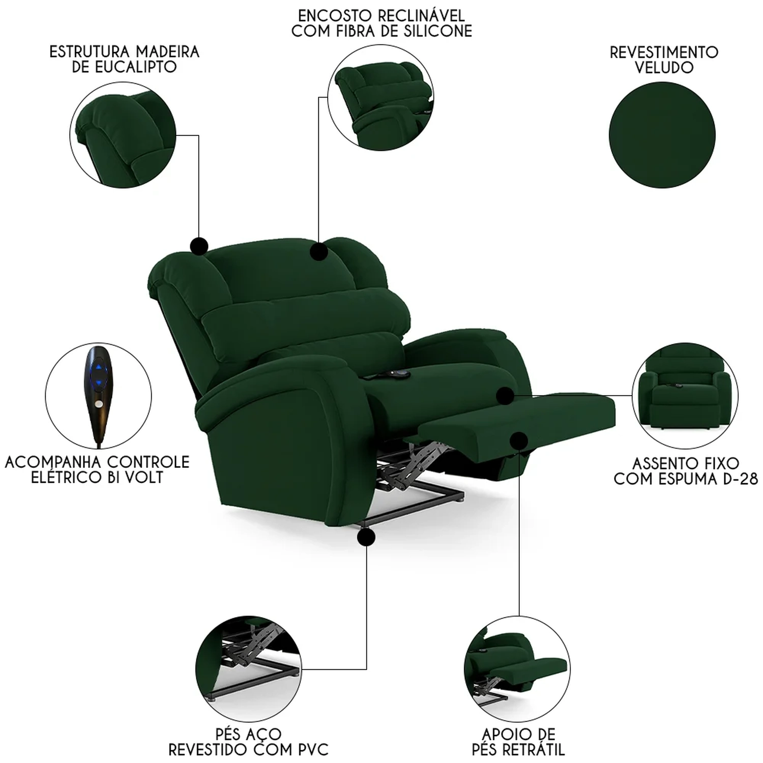 Imagine transformar sua Sala De Estar em um espaço de entretenimento de última geração com a Poltrona do Papai Reclinável Kalie Controle Power Elétrico FH9 Veludo Verde, da Mpozenato!