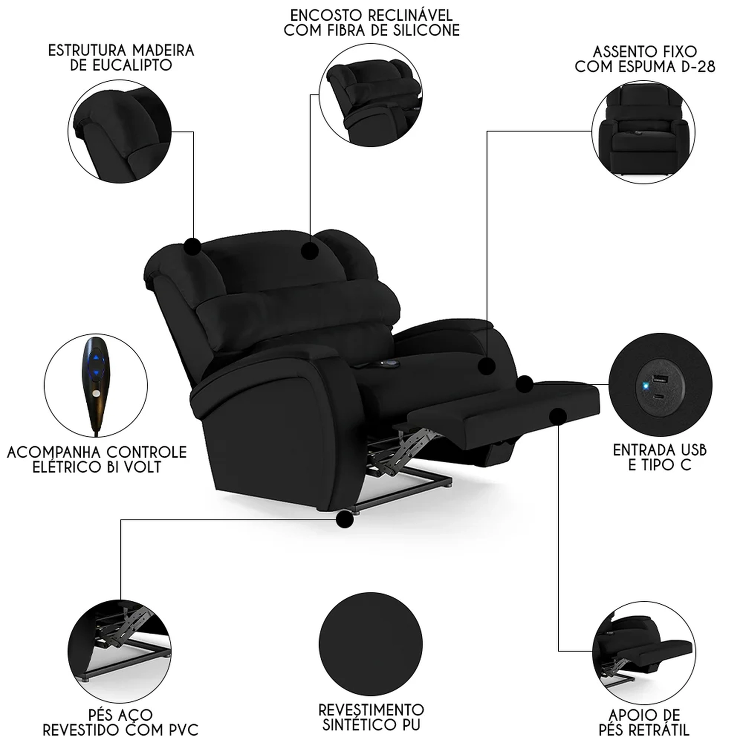 Com um design que alia modernidade e elegância, a Poltrona Reclinável é a escolha perfeita para aqueles que não abrem mão do conforto supremo. Seja mergulhando nas páginas de um bom livro ou se deliciando com seus filmes e séries prediletos, esta Poltrona Do Papai promete ser o seu refúgio particular. A funcionalidade do encosto reclinável, o apoio para os pés e o controle elétrico bi-volt são pensados para proporcionar uma experiência imersiva sem igual. Ah! E ela ainda conta com entrada USB e tipo C ideal para carregar seus eletrônicos enquanto descansa. E não é só sobre conforto, mas também sobre durabilidade e estilo, como a madeira maciça de eucalipto e o revestimento de alta qualidade. As dimensões generosas garantem que você tenha espaço de sobra para relaxar, enquanto a capacidade de suportar até 110kg assegura que é uma peça robusta e confiável. Não é apenas uma poltrona, é um upgrade na sua qualidade de vida, trazendo o glamour do cinema diretamente para o seu lar.