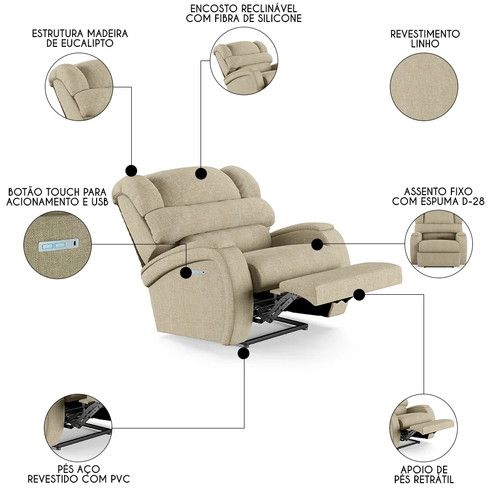 Hora de deixar a sua Sala De Estar mais moderna e transformar em um espaço de entretenimento de última geração com a Poltrona do Papai Reclinável Kalie Power Touch FH9 Linho Bege, da Mpozenato!