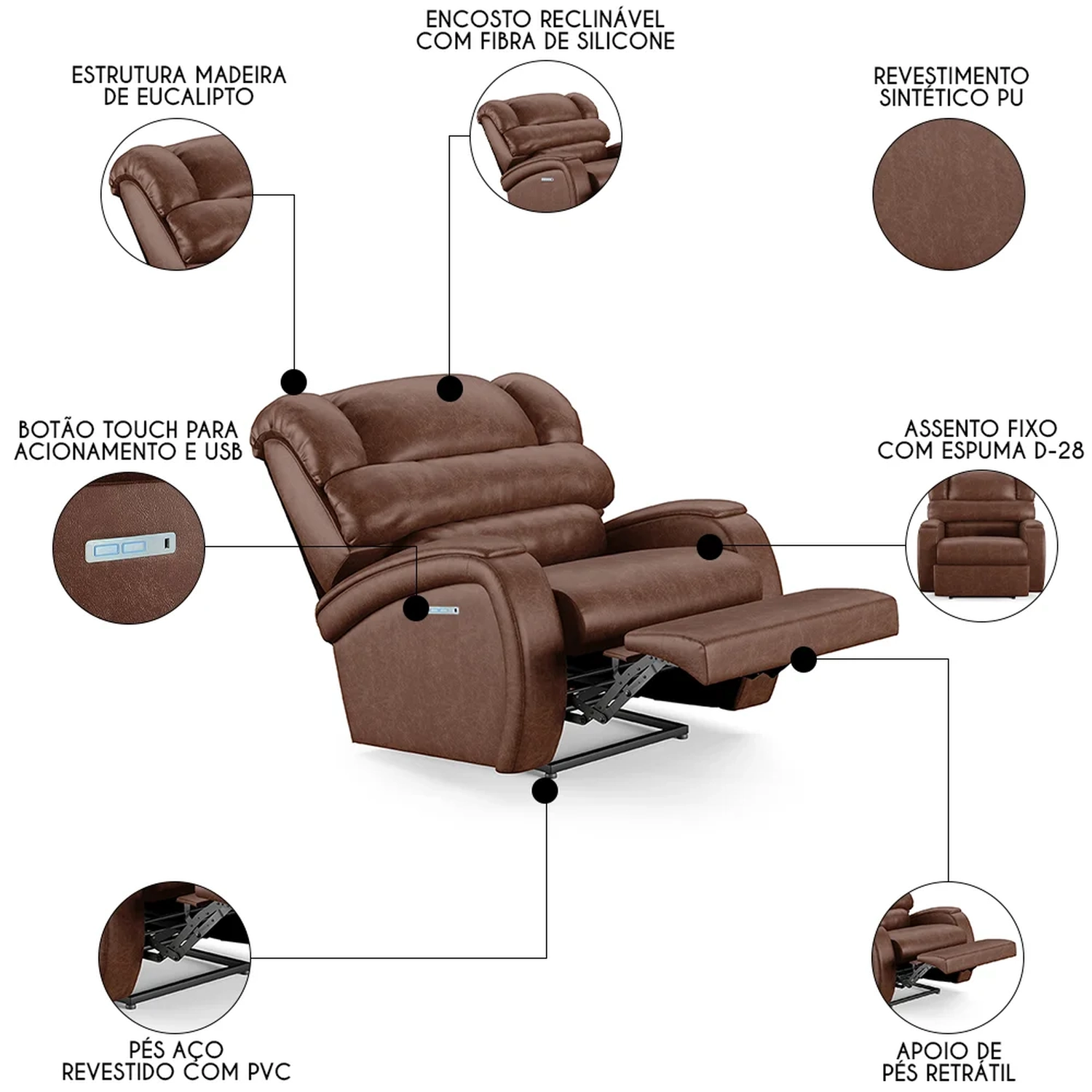 Hora de deixar a sua Sala De Estar mais moderna e transformar em um espaço de entretenimento de última geração com a Poltrona do Papai Reclinável Kalie Power Touch FH9 PU Marrom Brilho, da Mpozenato!