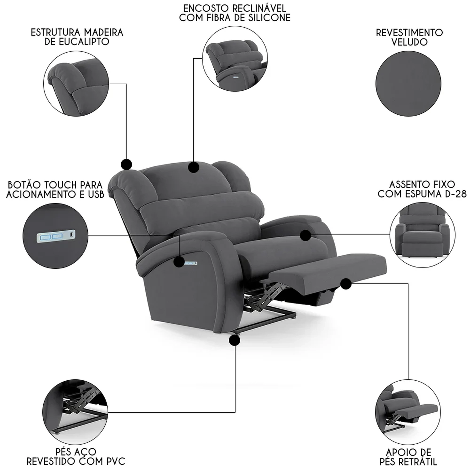 Hora de deixar a sua Sala De Estar mais moderna e transformar em um espaço de entretenimento de última geração com a Poltrona do Papai Reclinável Kalie Power Touch FH9 Veludo Cinza, da Mpozenato!