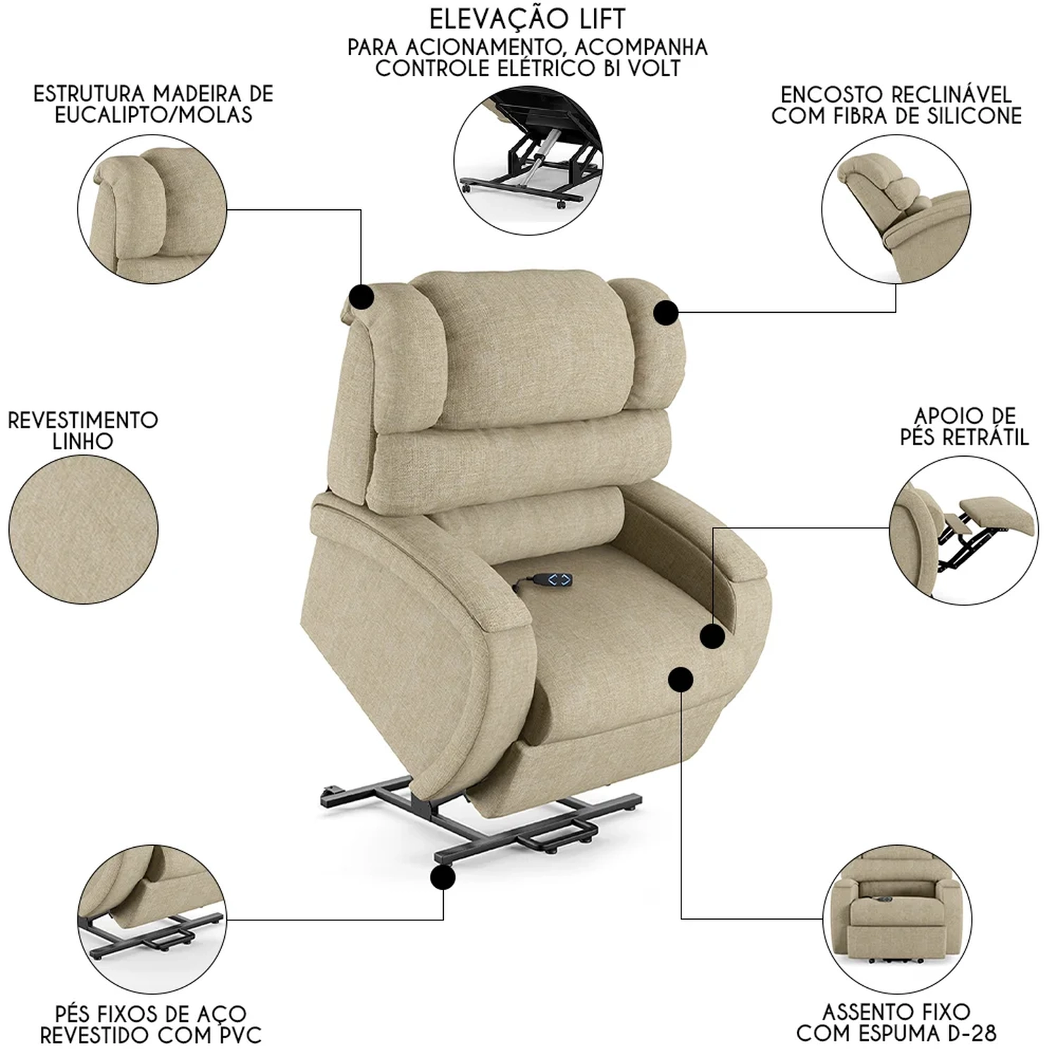 A Poltrona do Papai Reclinável Kalie Elevação Lift Elétrico FH9 Linho Bege, da Mpozenato é uma peça de mobiliário que redefine o conforto e a acessibilidade na sua Sala De Estar.