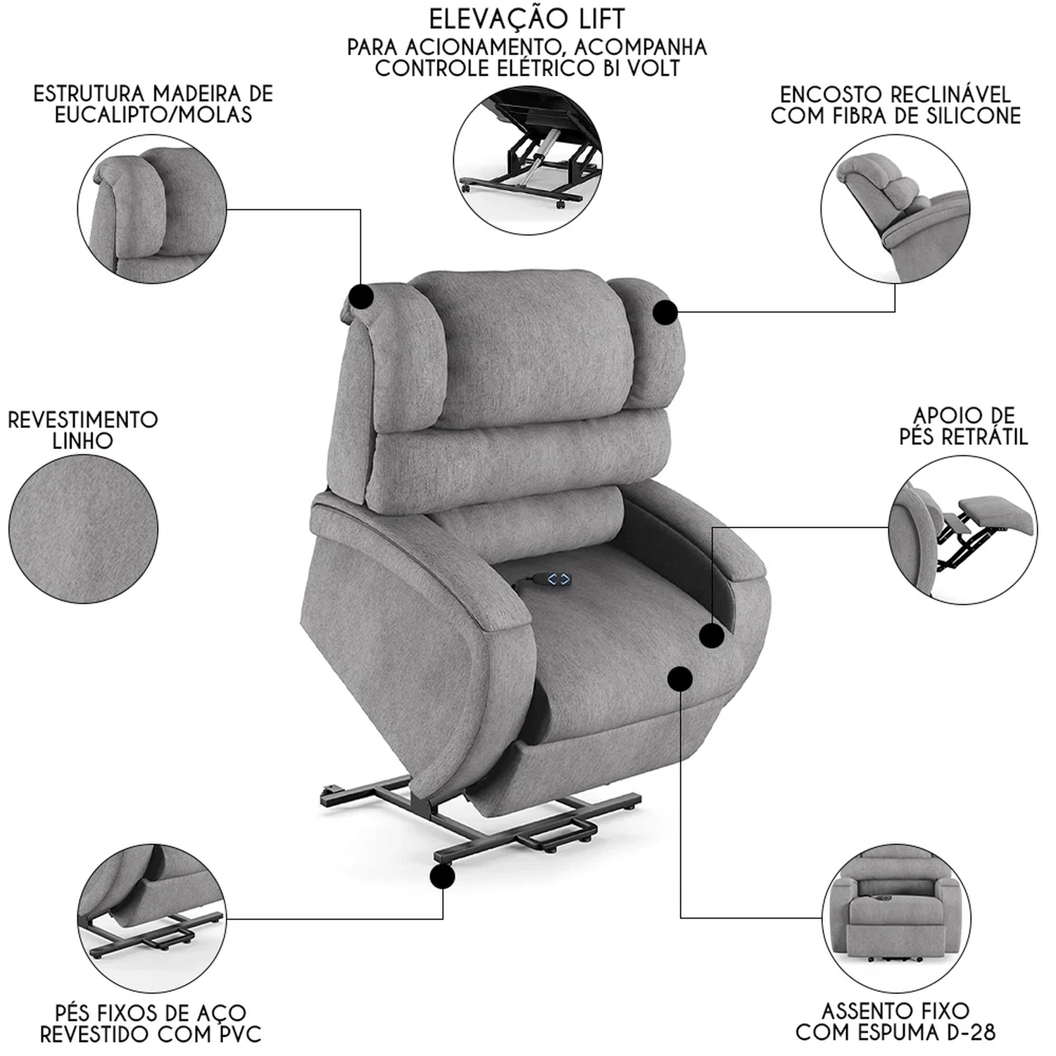 A Poltrona do Papai Reclinável Kalie Elevação Lift Elétrico FH9 Linho Cinza, da Mpozenato é uma peça de mobiliário que redefine o conforto e a acessibilidade na sua Sala De Estar.