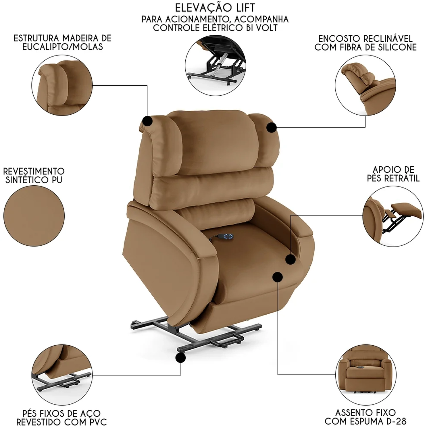 Com seu revestimento de qualidade, ela não só oferece uma superfície fácil de limpar, mas também um toque de sofisticação ao ambiente. Produzida com estrutura em eucalipto, assento em espuma D28 e molas, encosto em fibra de silicone são materiais que garantem mais qualidade e durabilidade a peça. O mecanismo LIFT é um exemplo de inovação, permitindo um ajuste suave da inclinação e elevação da poltrona, tornando-a ideal para aqueles que buscam alívio e suporte após um longo dia. A Poltrona Pós Operatório traz funcionalidade de elevação benéfica para evitar a força nos joelhos na hora de se levantar, para pessoas que enfrentam desafios de mobilidade, idosos ou gestantes, facilitando o movimento de sentar e levantar sem esforço adicional. A característica bivolt da Poltrona Do Papai com controle assegura que ela possa ser utilizada em diversos ambientes, adaptando-se a diferentes necessidades elétricas sem a preocupação de incompatibilidade de tensão. O apoio para os pés, que se eleva em conjunto com o encosto, é projetado para promover uma postura ergonômica, aliviando a tensão nas pernas e na lombar, enquanto os braços largos oferecem um suporte adicional e um conforto extra durante o uso.