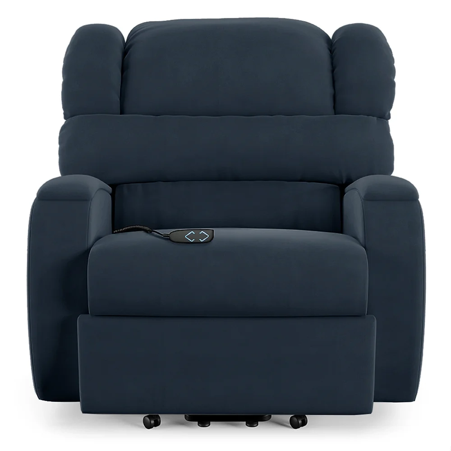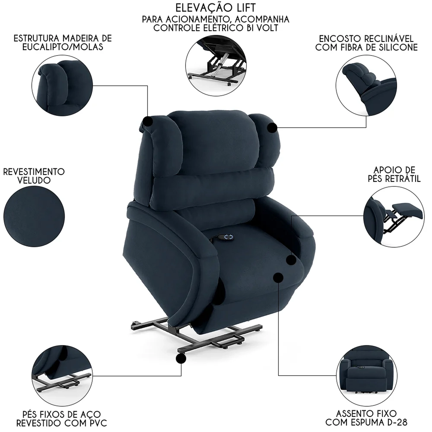 A Poltrona do Papai Reclinável Kalie Elevação Lift Elétrico FH9 Veludo Azul, da Mpozenato é uma peça de mobiliário que redefine o conforto e a acessibilidade na sua Sala De Estar.