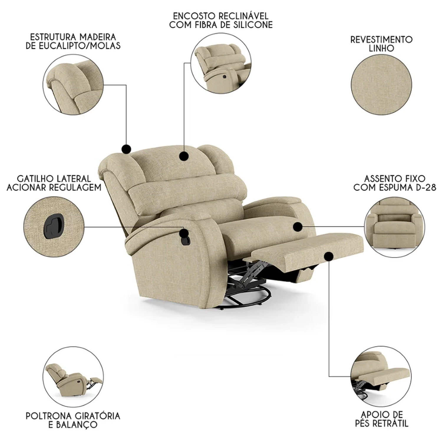 Com seu design moderno e elegante, ela não só complementa a decoração de sua casa, mas também oferece um conforto inigualável. Seja mergulhando nas páginas de um bom livro ou se deliciando com seus filmes e séries prediletos, essa Poltrona Reclinável será o seu refúgio particular. A combinação do sistema glider ao encosto e apoio para os pés ativados com mecanismo manual proporcionam uma experiência de relaxamento total, pois ela é giratória e possui balanço. Fabricada com materiais de alta qualidade, como a madeira de eucalipto e espuma D-28, ela garante durabilidade e suporte. Além disso o revestimento de alta qualidade é um detalhe que enriquece ainda mais a sua experiência. Não deixe escapar a chance de elevar sua sala de estar a um novo patamar de conforto e estilo com a Poltrona Do Papai.