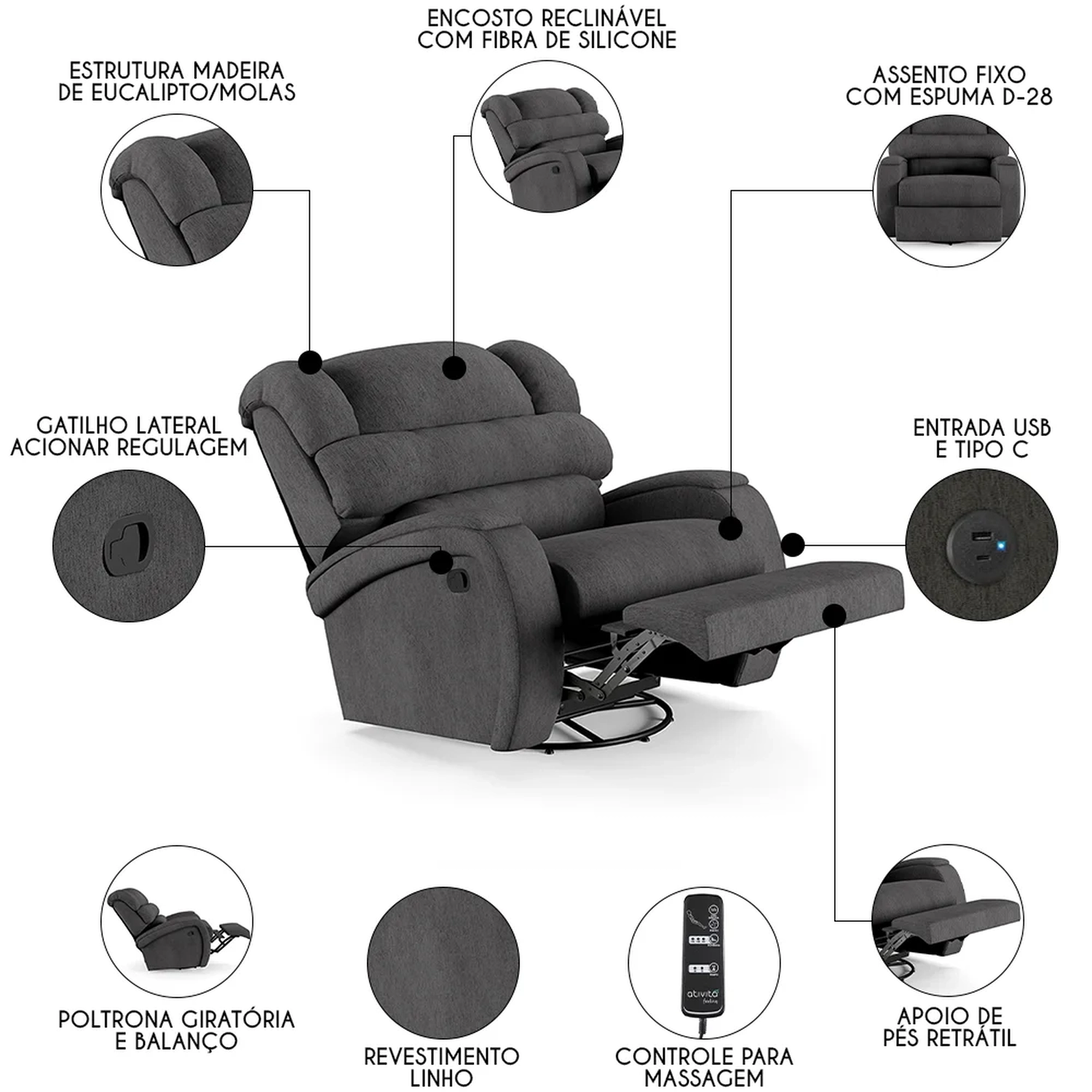 Com seu design moderno e elegante, ela não só complementa a decoração de sua casa, mas também oferece um conforto inigualável. Seja mergulhando nas páginas de um bom livro ou se deliciando com seus filmes e séries prediletos, essa Poltrona Massageadora será o seu refúgio particular. A combinação do sistema glider ao encosto e apoio para os pés ativados com mecanismo manual proporcionam uma experiência de relaxamento total, pois ela é giratória com balanço, e acompanha controle para acionar a massagem. Ah! E ela ainda conta com entrada USB e tipo C ideal para carregar seus eletrônicos enquanto descansa. Fabricada com materiais de alta qualidade, como a madeira de eucalipto e espuma D-28, ela garante durabilidade e suporte. Além disso o revestimento de alta qualidade é um detalhe que enriquece ainda mais a sua experiência. Não deixe escapar a chance de elevar sua sala de estar a um novo patamar de conforto e estilo com a Poltrona Do Papai.