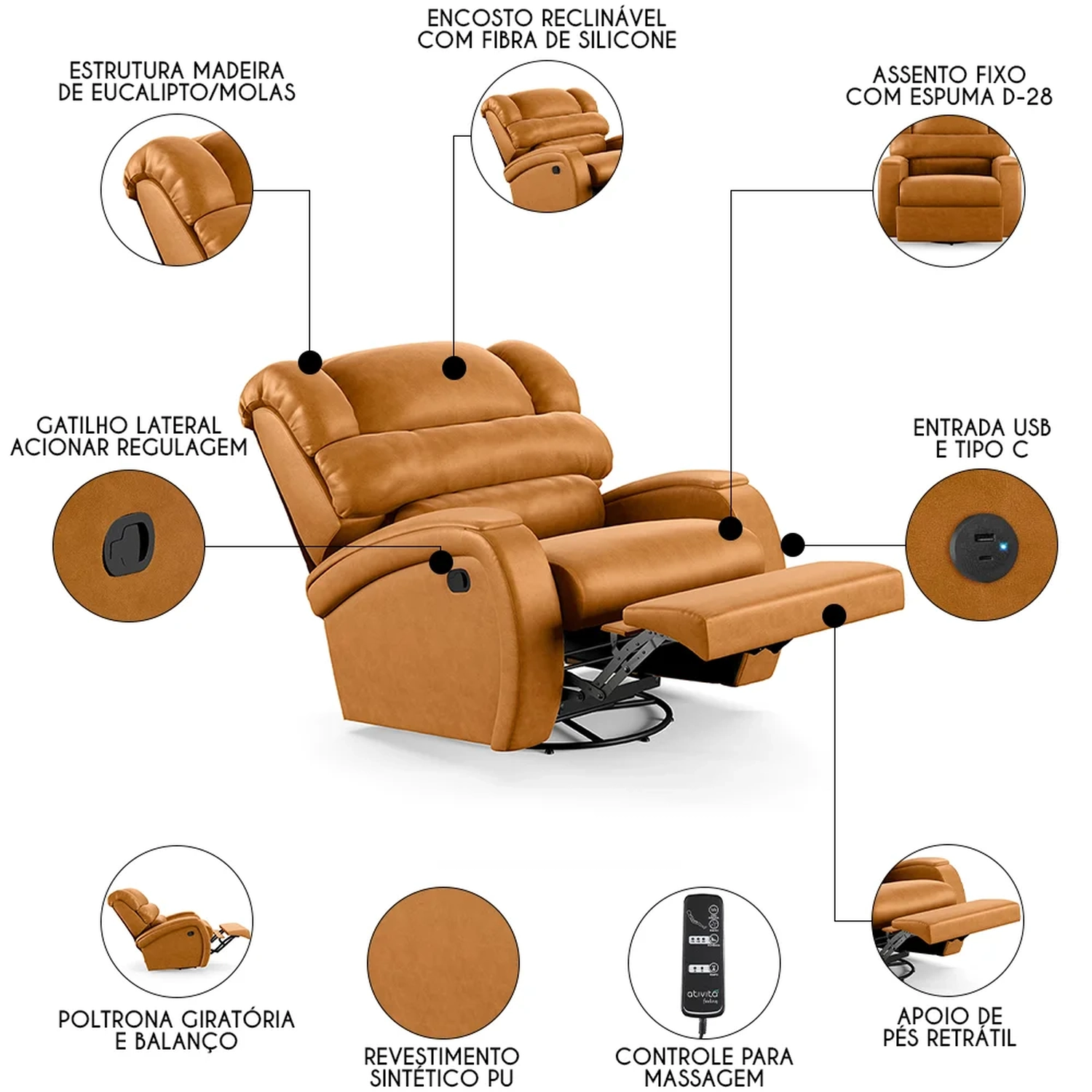 Com seu design moderno e elegante, ela não só complementa a decoração de sua casa, mas também oferece um conforto inigualável. Seja mergulhando nas páginas de um bom livro ou se deliciando com seus filmes e séries prediletos, essa Poltrona Massageadora será o seu refúgio particular. A combinação do sistema glider ao encosto e apoio para os pés ativados com mecanismo manual proporcionam uma experiência de relaxamento total, pois ela é giratória com balanço, e acompanha controle para acionar a massagem. Ah! E ela ainda conta com entrada USB e tipo C ideal para carregar seus eletrônicos enquanto descansa. Fabricada com materiais de alta qualidade, como a madeira de eucalipto e espuma D-28, ela garante durabilidade e suporte. Além disso o revestimento de alta qualidade é um detalhe que enriquece ainda mais a sua experiência. Não deixe escapar a chance de elevar sua sala de estar a um novo patamar de conforto e estilo com a Poltrona Do Papai.
