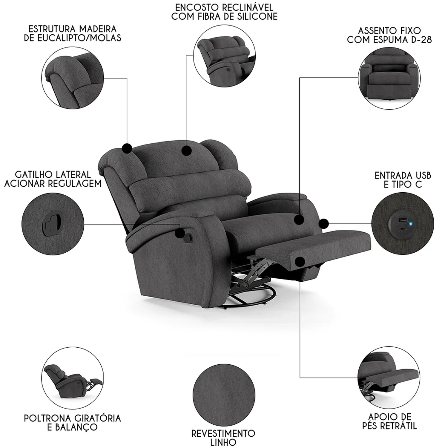 Com seu design moderno e elegante, ela não só complementa a decoração de sua casa, mas também oferece um conforto inigualável. Seja mergulhando nas páginas de um bom livro ou se deliciando com seus filmes e séries prediletos, essa Poltrona Reclinável será o seu refúgio particular. A combinação do sistema glider ao encosto e apoio para os pés ativados com mecanismo manual proporcionam uma experiência de relaxamento total, pois ela é giratória e possui balanço. Ah! E ela ainda conta com entrada USB e tipo C ideal para carregar seus eletrônicos enquanto descansa. Fabricada com materiais de alta qualidade, como a madeira de eucalipto e espuma D-28, ela garante durabilidade e suporte. Além disso o revestimento de alta qualidade é um detalhe que enriquece ainda mais a sua experiência. Não deixe escapar a chance de elevar sua sala de estar a um novo patamar de conforto e estilo com a Poltrona Do Papai.