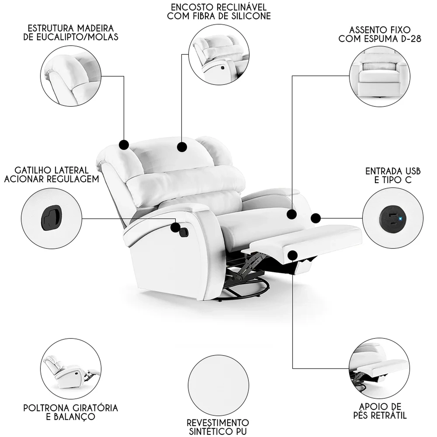 Com seu design moderno e elegante, ela não só complementa a decoração de sua casa, mas também oferece um conforto inigualável. Seja mergulhando nas páginas de um bom livro ou se deliciando com seus filmes e séries prediletos, essa Poltrona Reclinável será o seu refúgio particular. A combinação do sistema glider ao encosto e apoio para os pés ativados com mecanismo manual proporcionam uma experiência de relaxamento total, pois ela é giratória e possui balanço. Ah! E ela ainda conta com entrada USB e tipo C ideal para carregar seus eletrônicos enquanto descansa. Fabricada com materiais de alta qualidade, como a madeira de eucalipto e espuma D-28, ela garante durabilidade e suporte. Além disso o revestimento de alta qualidade é um detalhe que enriquece ainda mais a sua experiência. Não deixe escapar a chance de elevar sua sala de estar a um novo patamar de conforto e estilo com a Poltrona Do Papai.
