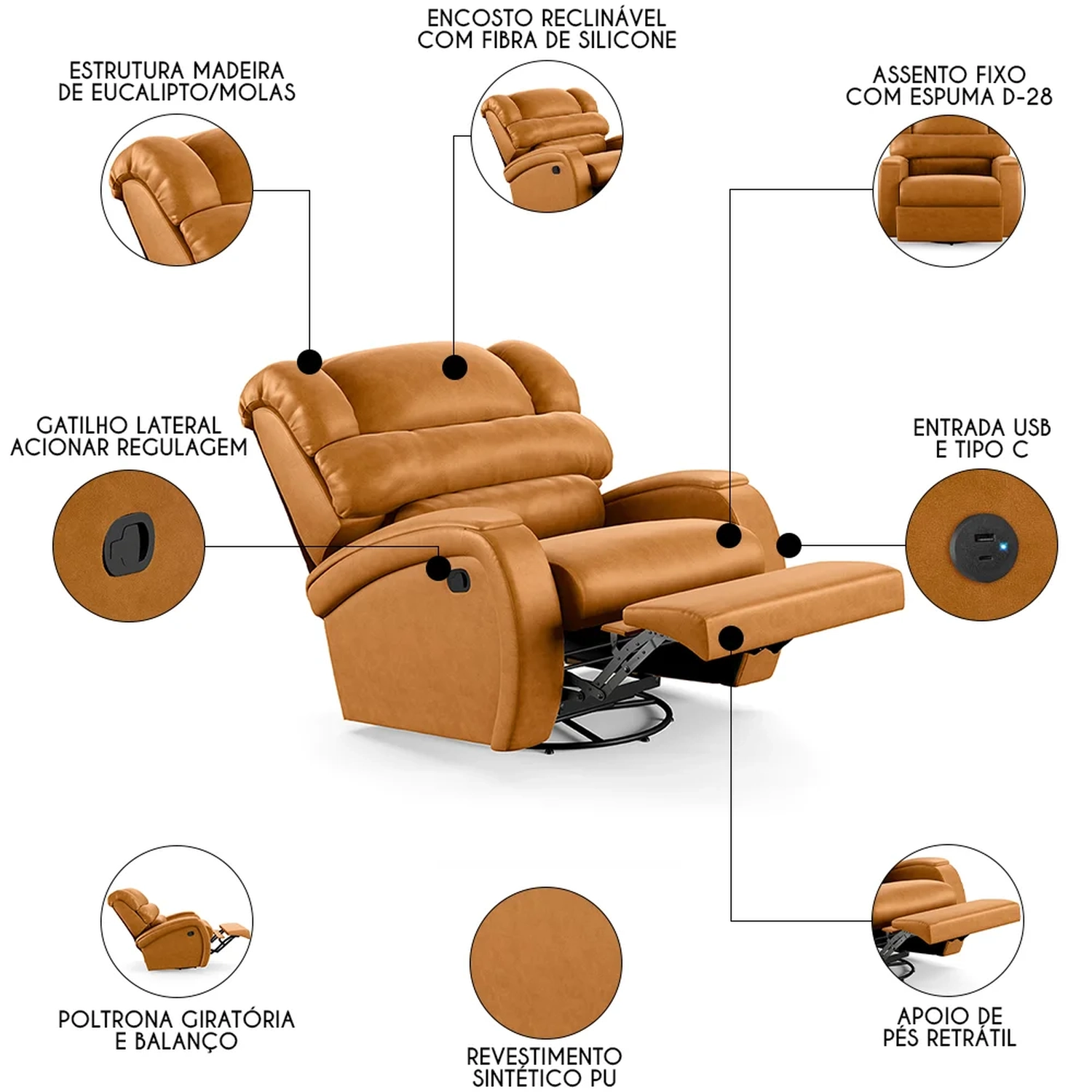 Com seu design moderno e elegante, ela não só complementa a decoração de sua casa, mas também oferece um conforto inigualável. Seja mergulhando nas páginas de um bom livro ou se deliciando com seus filmes e séries prediletos, essa Poltrona Reclinável será o seu refúgio particular. A combinação do sistema glider ao encosto e apoio para os pés ativados com mecanismo manual proporcionam uma experiência de relaxamento total, pois ela é giratória e possui balanço. Ah! E ela ainda conta com entrada USB e tipo C ideal para carregar seus eletrônicos enquanto descansa. Fabricada com materiais de alta qualidade, como a madeira de eucalipto e espuma D-28, ela garante durabilidade e suporte. Além disso o revestimento de alta qualidade é um detalhe que enriquece ainda mais a sua experiência. Não deixe escapar a chance de elevar sua sala de estar a um novo patamar de conforto e estilo com a Poltrona Do Papai.