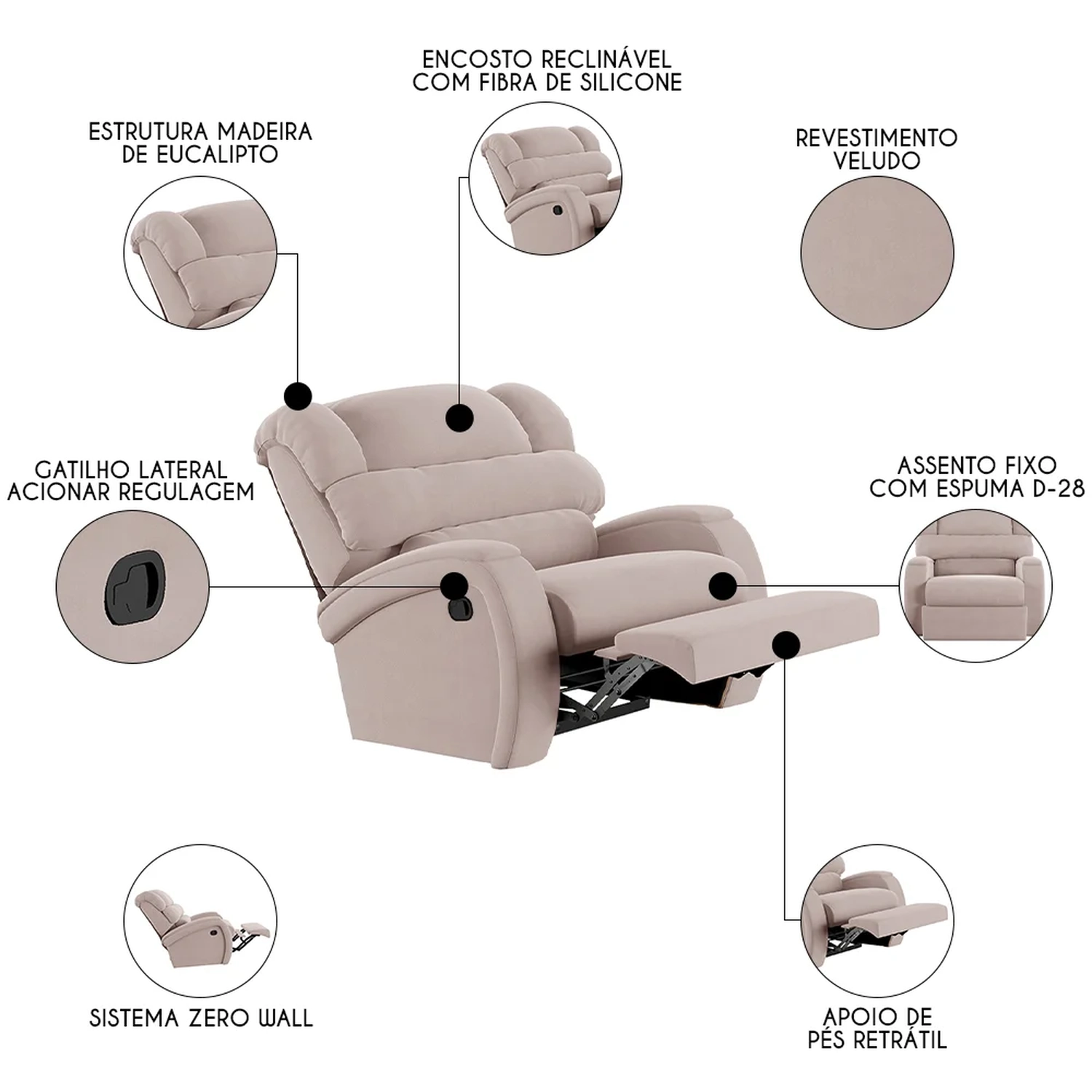 Hora de transformar sua Sala De Estar em um espaço de entretenimento comparável a uma sala de cinema privada? A Poltrona do Papai Reclinável Kalie Manual Gatilho FH9 Veludo Rosê, da Mpozenato é a adição perfeita para alcançar esse sonho.