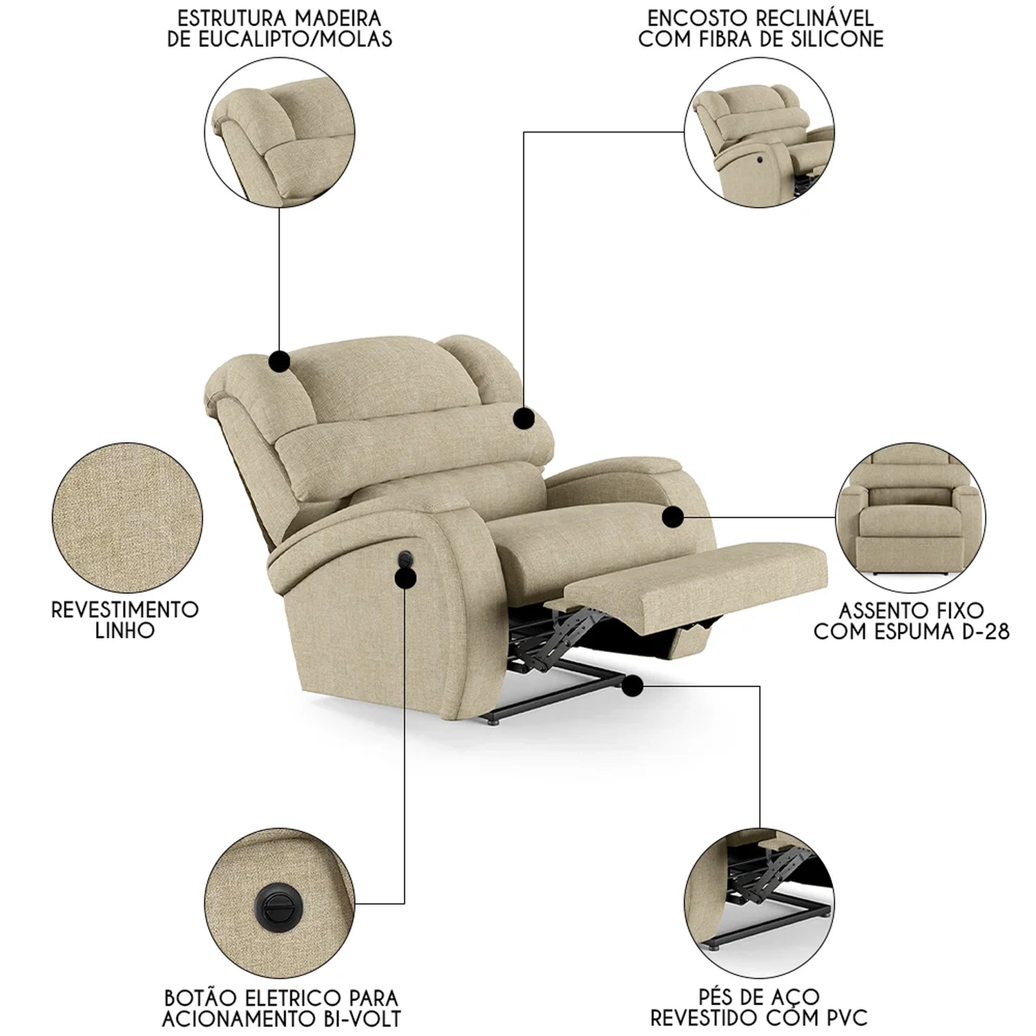 Transforme sua Sala De Estar em um espaço de entretenimento de última geração com a Poltrona do Papai Reclinável Kalie Power Elétrica FH9 Linho Bege, da Mpozenato!