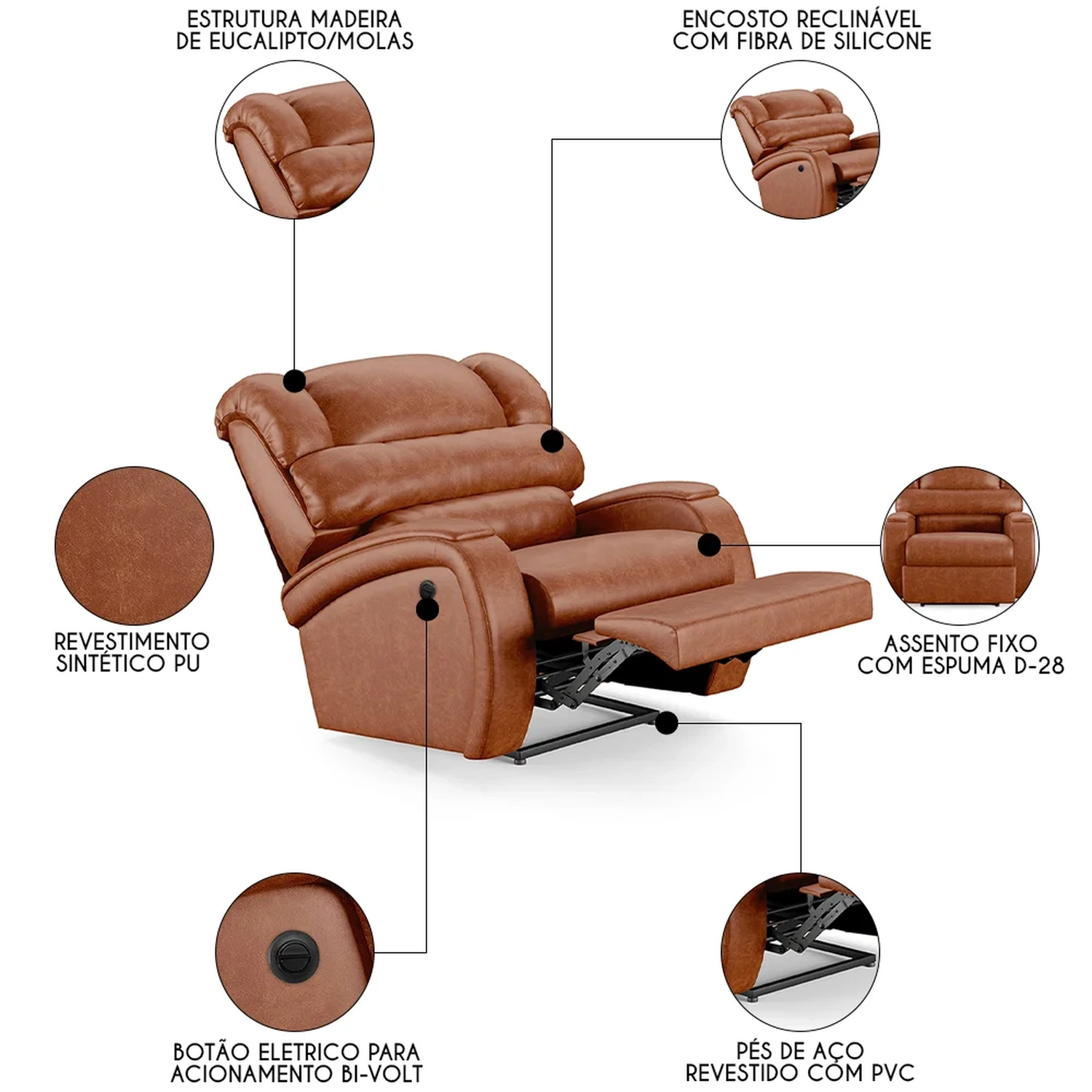 Transforme sua Sala De Estar em um espaço de entretenimento de última geração com a Poltrona do Papai Reclinável Kalie Power Elétrica FH9 PU Caramelo Brilho, da Mpozenato!