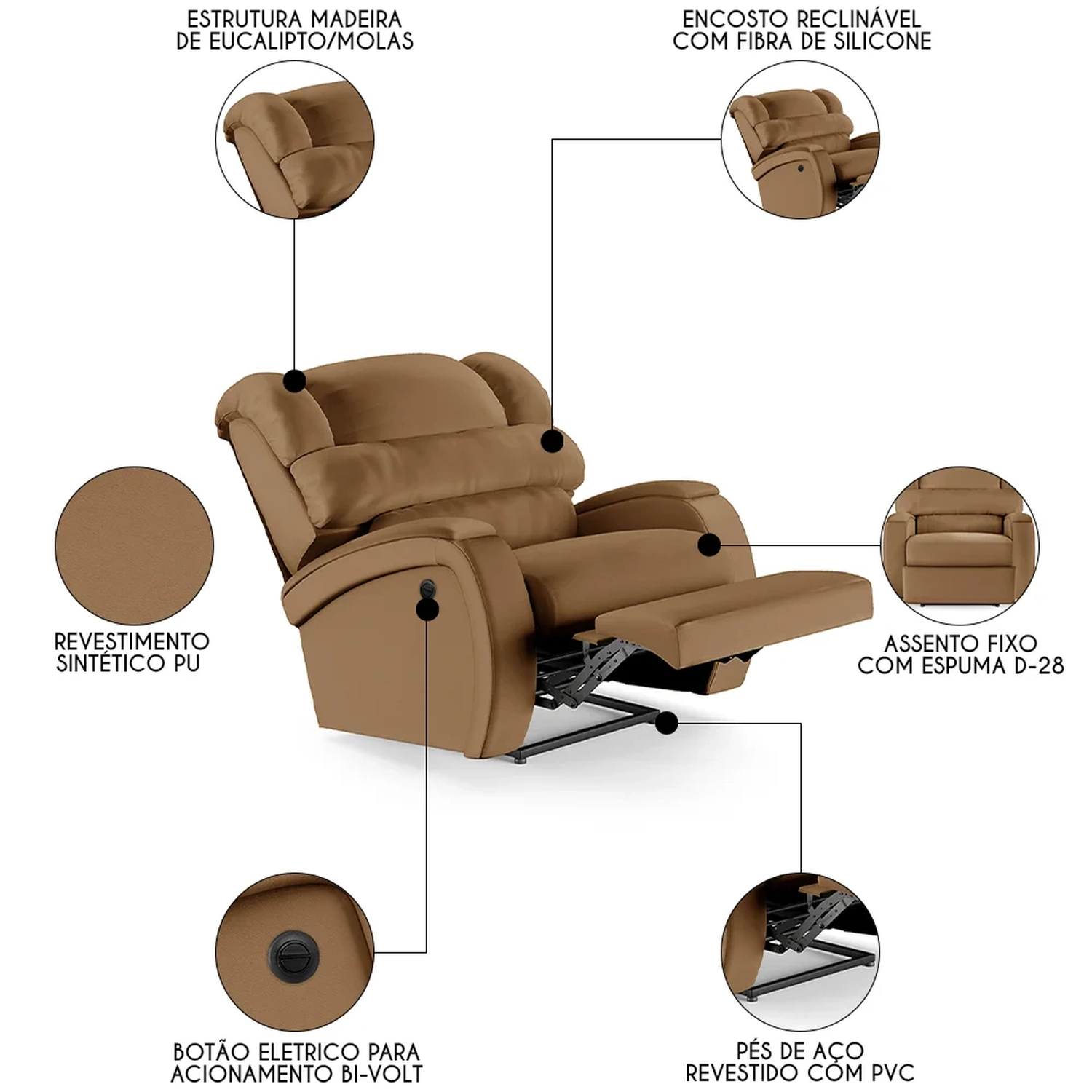 Transforme sua Sala De Estar em um espaço de entretenimento de última geração com a Poltrona do Papai Reclinável Kalie Power Elétrica FH9 PU Caramelo, da Mpozenato!