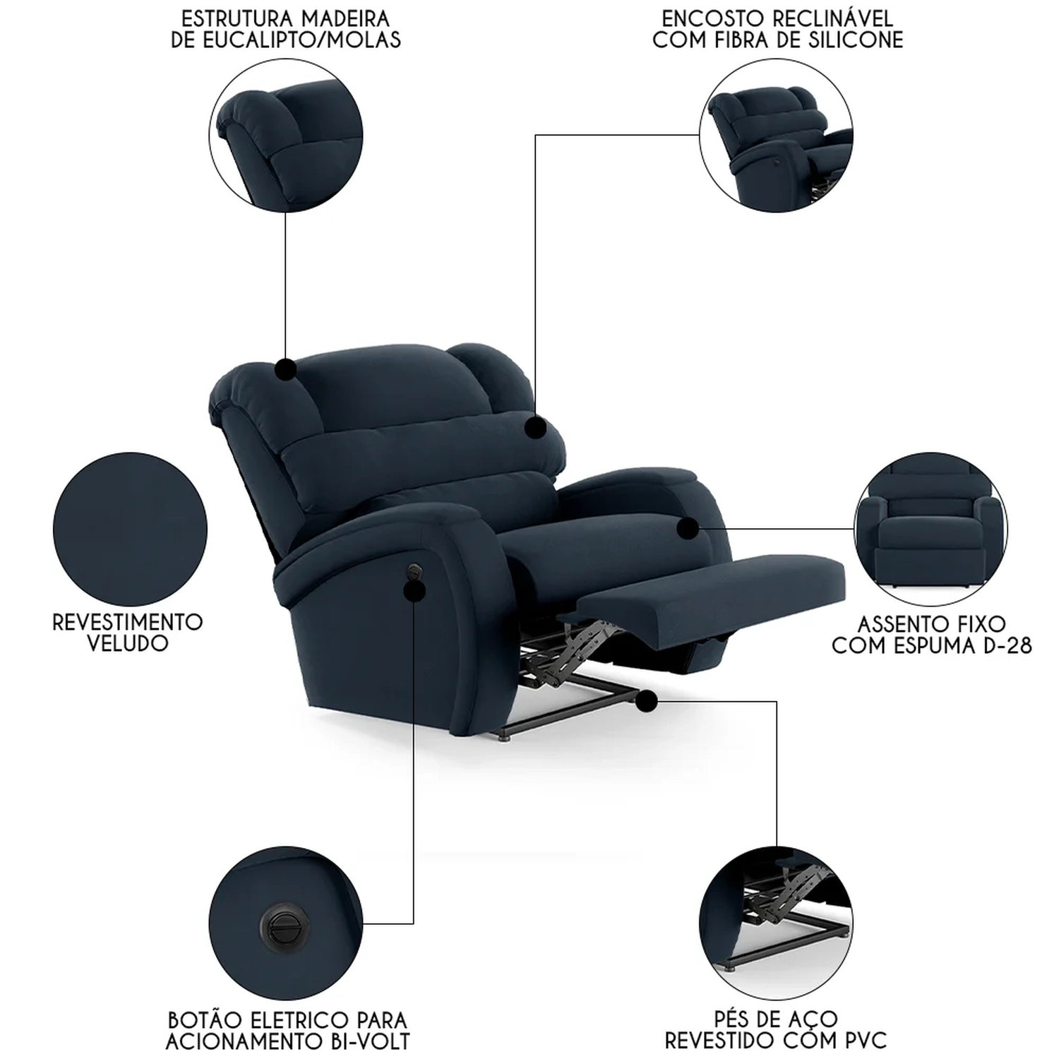 Transforme sua Sala De Estar em um espaço de entretenimento de última geração com a Poltrona do Papai Reclinável Kalie Power Elétrica FH9 Veludo Azul, da Mpozenato!