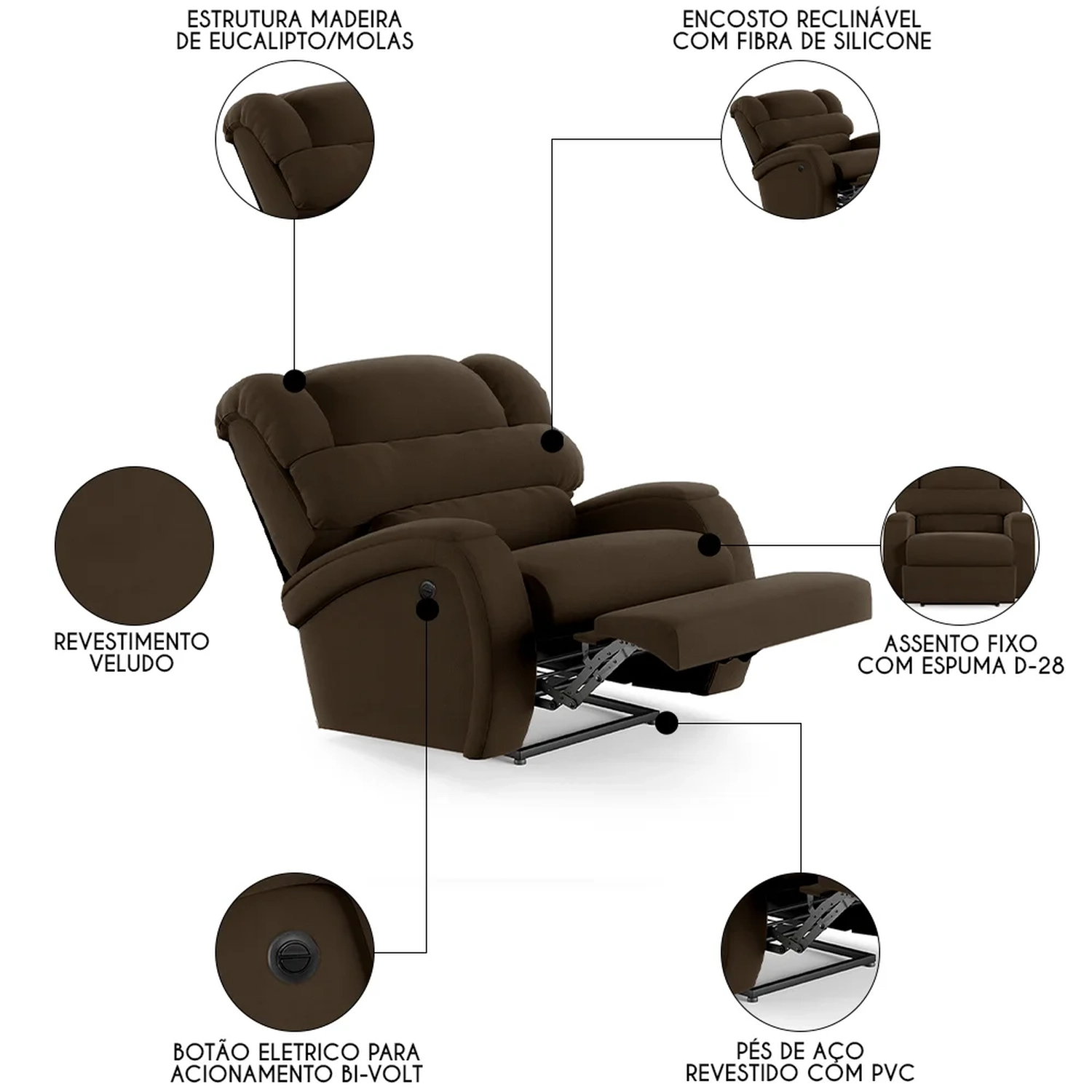 Transforme sua Sala De Estar em um espaço de entretenimento de última geração com a Poltrona do Papai Reclinável Kalie Power Elétrica FH9 Veludo Marrom, da Mpozenato!