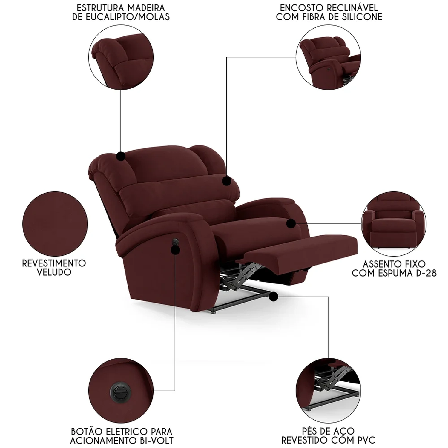 Transforme sua Sala De Estar em um espaço de entretenimento de última geração com a Poltrona do Papai Reclinável Kalie Power Elétrica FH9 Veludo Vinho, da Mpozenato!