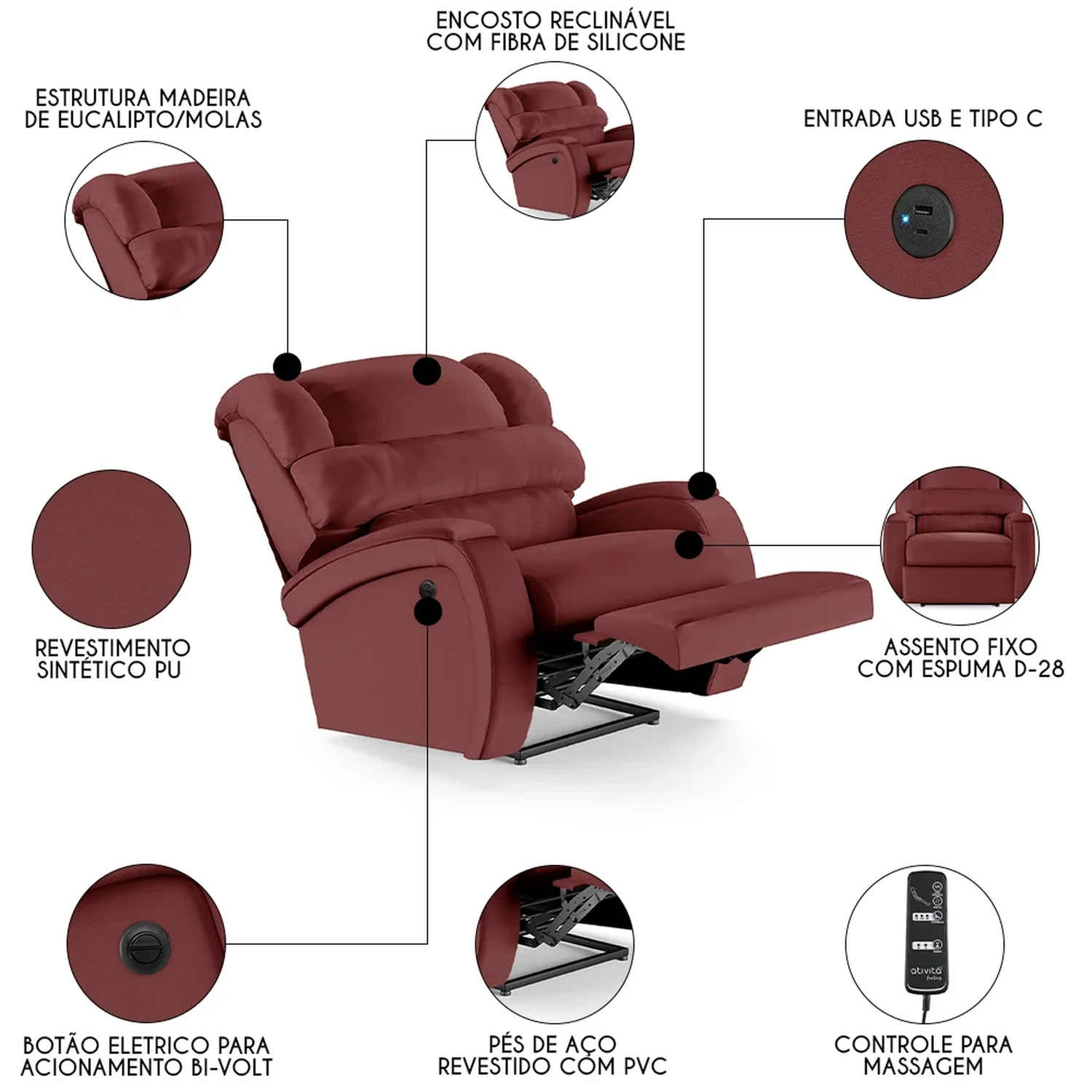 Mecanismo: Botão Elétrico, controle de massagem e entrada USB.