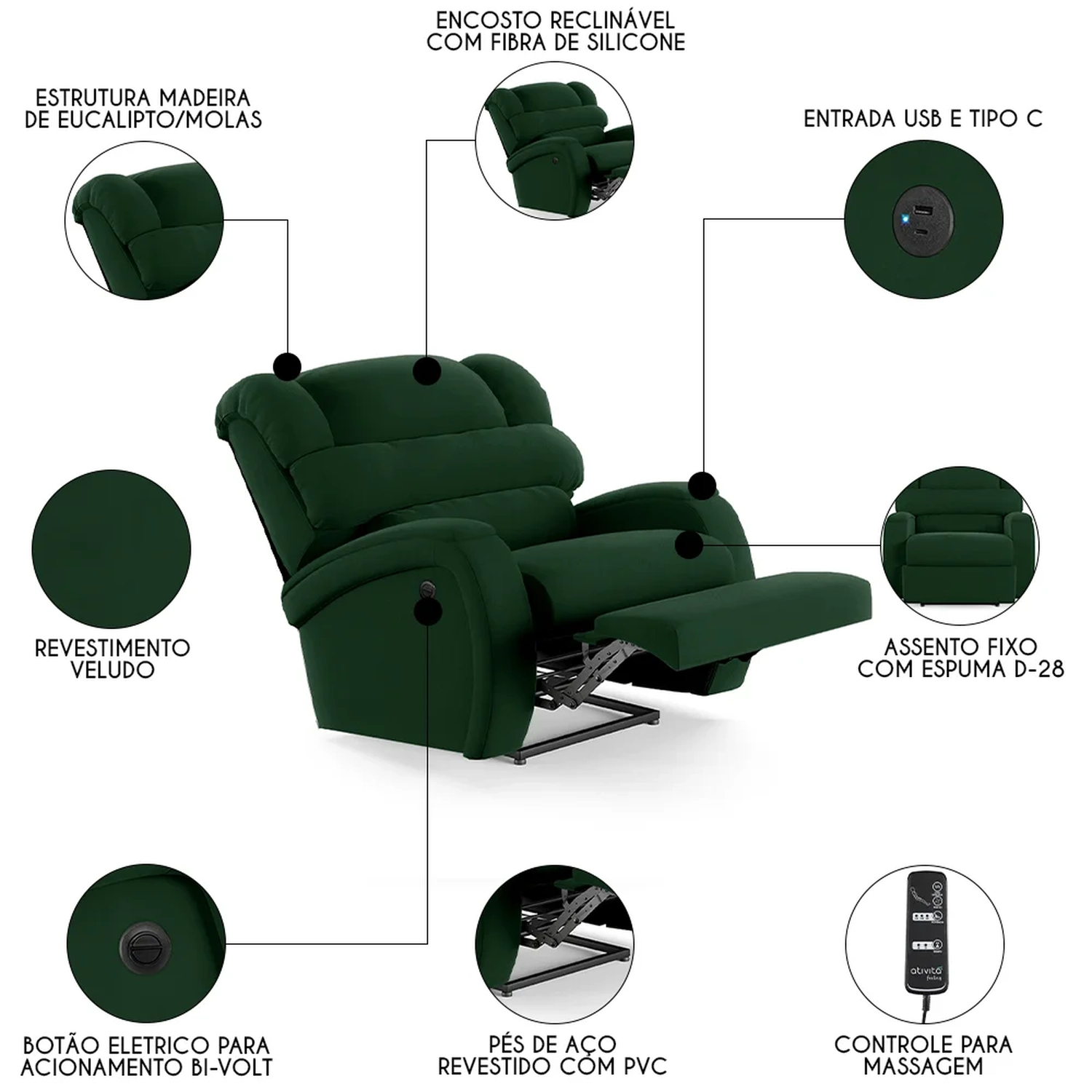 A Poltrona do Papai Reclinável Kalie Power Elétrica USB FH9 Veludo Verde, da Mpozenato é ideal para transformar a sua Sala De Estar em um espaço confortável de entretenimento de última geração!
