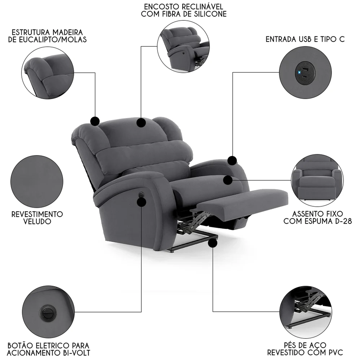 Conheça a Poltrona do Papai Reclinável Kalie Power Elétrica USB FH9 Veludo Cinza, da Mpozenato. Ideal para transformar a sua Sala De Estar em um espaço de entretenimento de última geração!