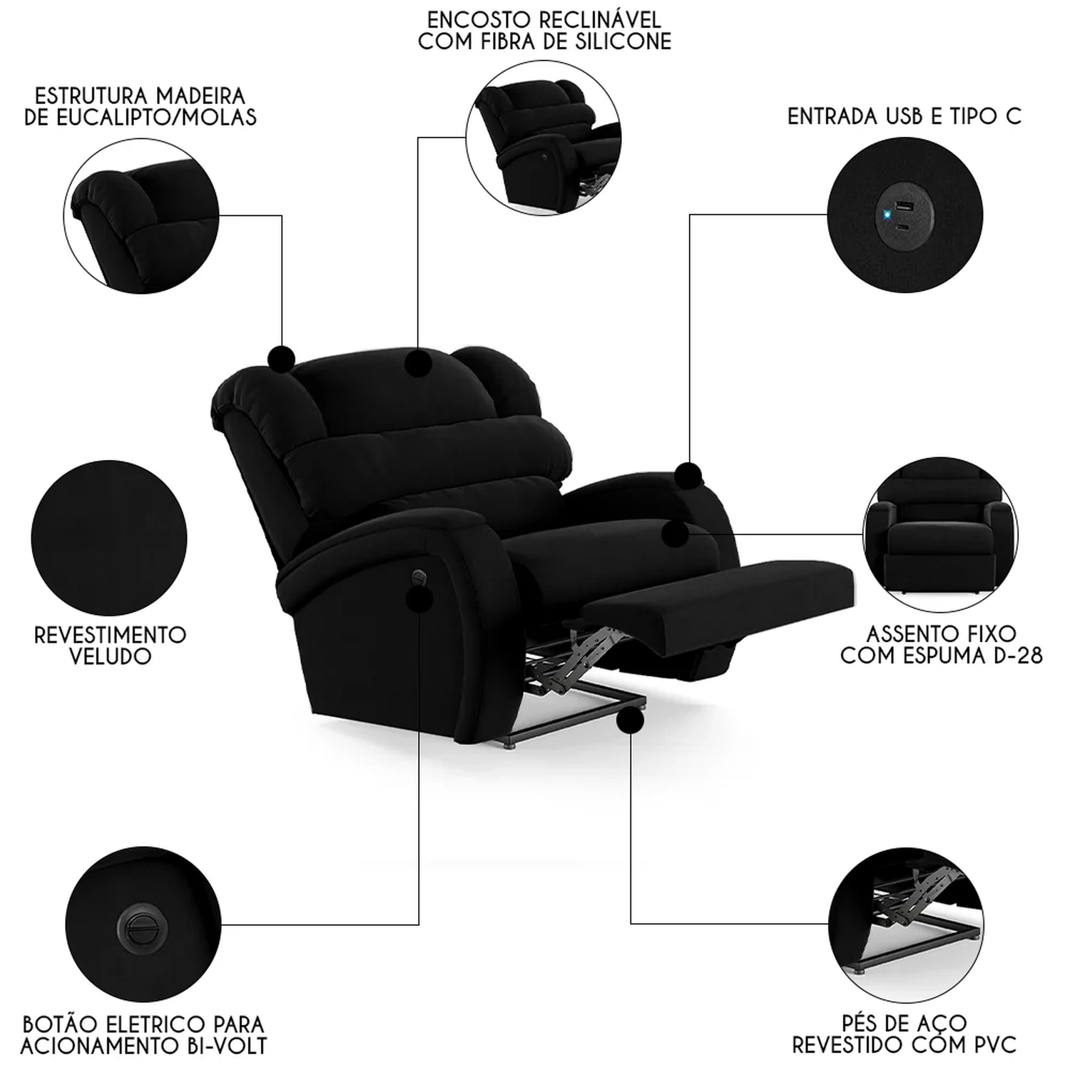 Com um design que alia modernidade e elegância, a Poltrona Reclinável é a escolha perfeita para aqueles que não abrem mão do conforto supremo. Seja mergulhando nas páginas de um bom livro ou se deliciando com seus filmes e séries prediletos, esta Poltrona Do Papai promete ser o seu refúgio particular. A facilidade de ajuste com o botão elétrico permite que você encontre a posição perfeita com o toque de um botão. Ah! E ela ainda conta com entrada USB e tipo C ideal para carregar seus eletrônicos enquanto descansa, tudo pensado para proporcionar uma experiência imersiva sem igual. E não é só sobre conforto, mas também sobre durabilidade e estilo, como a madeira maciça de eucalipto e o revestimento de alta qualidade. As dimensões generosas garantem que você tenha espaço de sobra para relaxar, enquanto a capacidade de suportar até 110kg assegura que é uma peça robusta e confiável. Não é apenas uma poltrona, é um upgrade na sua qualidade de vida, trazendo o glamour do cinema diretamente para o seu lar.