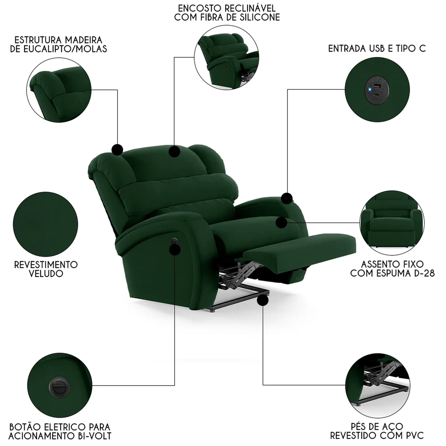 Com um design que alia modernidade e elegância, a Poltrona Reclinável é a escolha perfeita para aqueles que não abrem mão do conforto supremo. Seja mergulhando nas páginas de um bom livro ou se deliciando com seus filmes e séries prediletos, esta Poltrona Do Papai promete ser o seu refúgio particular. A facilidade de ajuste com o botão elétrico permite que você encontre a posição perfeita com o toque de um botão. Ah! E ela ainda conta com entrada USB e tipo C ideal para carregar seus eletrônicos enquanto descansa, tudo pensado para proporcionar uma experiência imersiva sem igual. E não é só sobre conforto, mas também sobre durabilidade e estilo, como a madeira maciça de eucalipto e o revestimento de alta qualidade. As dimensões generosas garantem que você tenha espaço de sobra para relaxar, enquanto a capacidade de suportar até 110kg assegura que é uma peça robusta e confiável. Não é apenas uma poltrona, é um upgrade na sua qualidade de vida, trazendo o glamour do cinema diretamente para o seu lar.