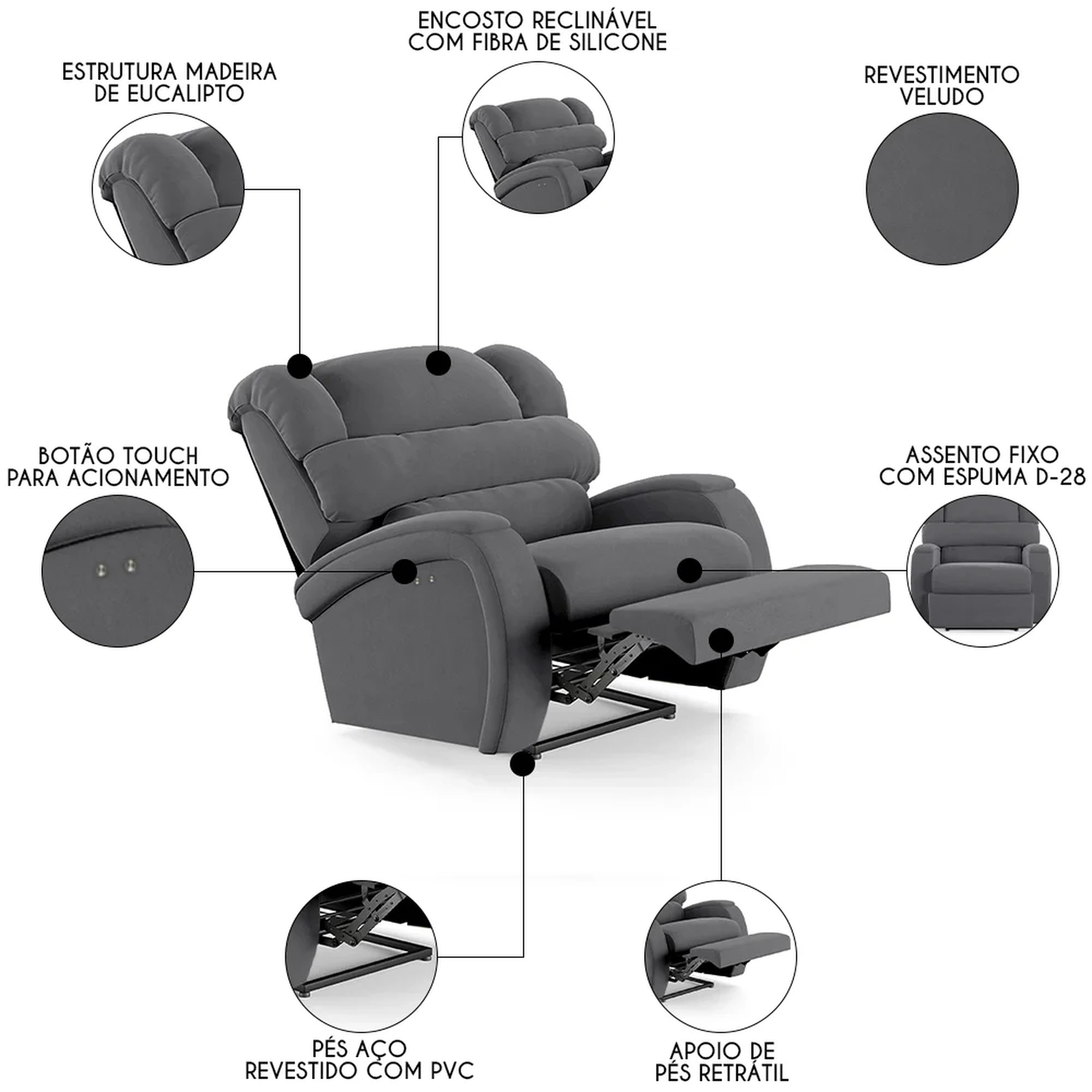 Hora de deixar a sua Sala De Estar mais moderna e transformar em um espaço de entretenimento de última geração com a Poltrona do Papai Reclinável Kalie Power Touch FH9 Veludo Cinza, da Mpozenato!