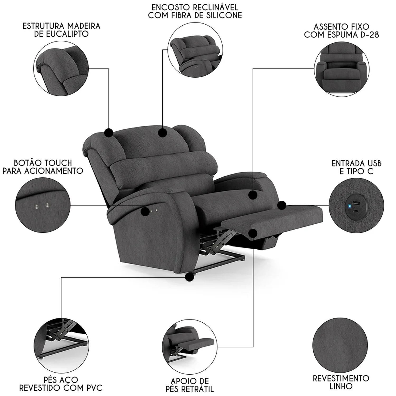 Conheça a Poltrona do Papai Reclinável Kalie Power Touch USB FH9 Linho Grafite, da Mpozenato. Ideal para transformar a sua Sala De Estar em um espaço de entretenimento de última geração!