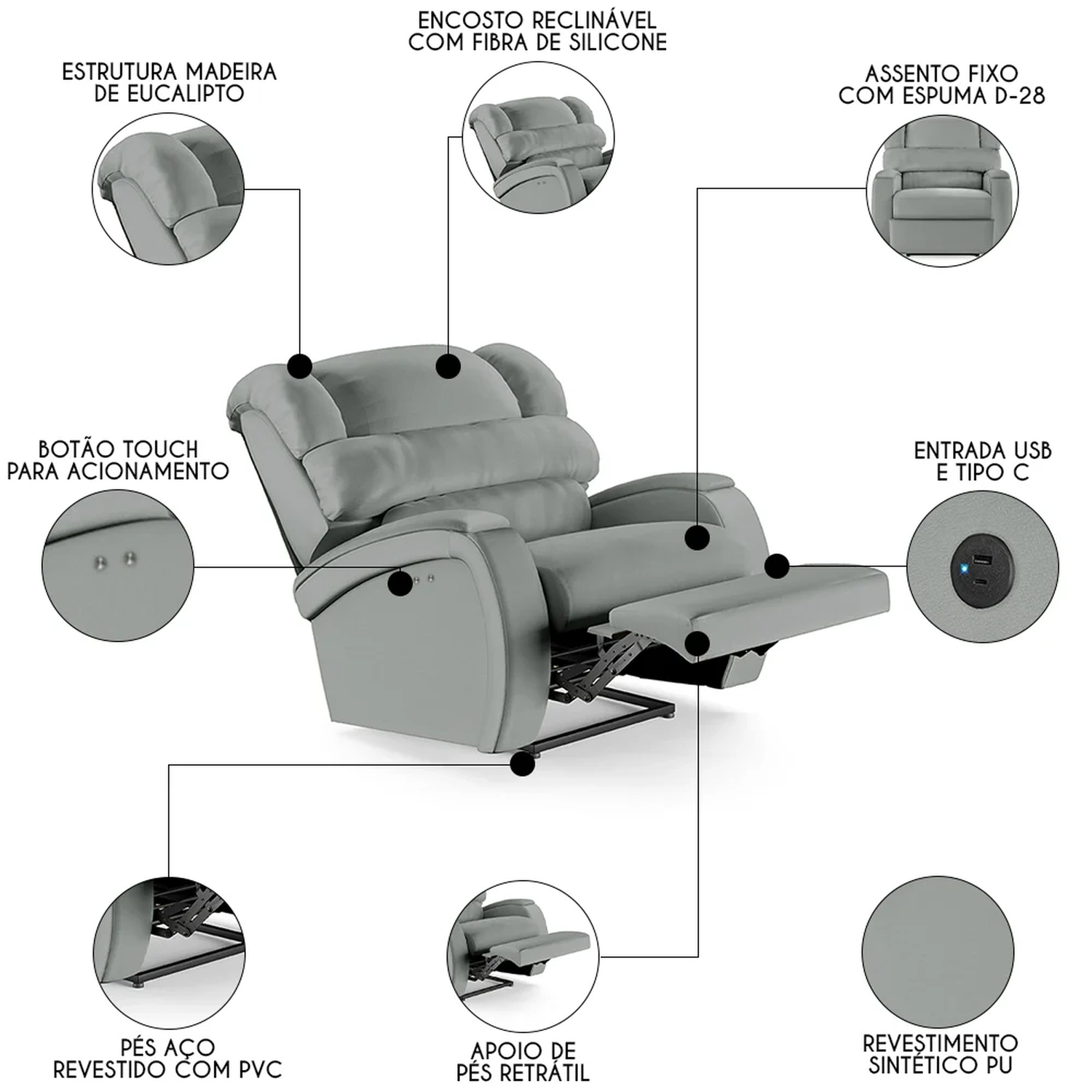 Conheça a Poltrona do Papai Reclinável Kalie Power Touch USB FH9 PU Cinza, da Mpozenato. Ideal para transformar a sua Sala De Estar em um espaço de entretenimento de última geração!