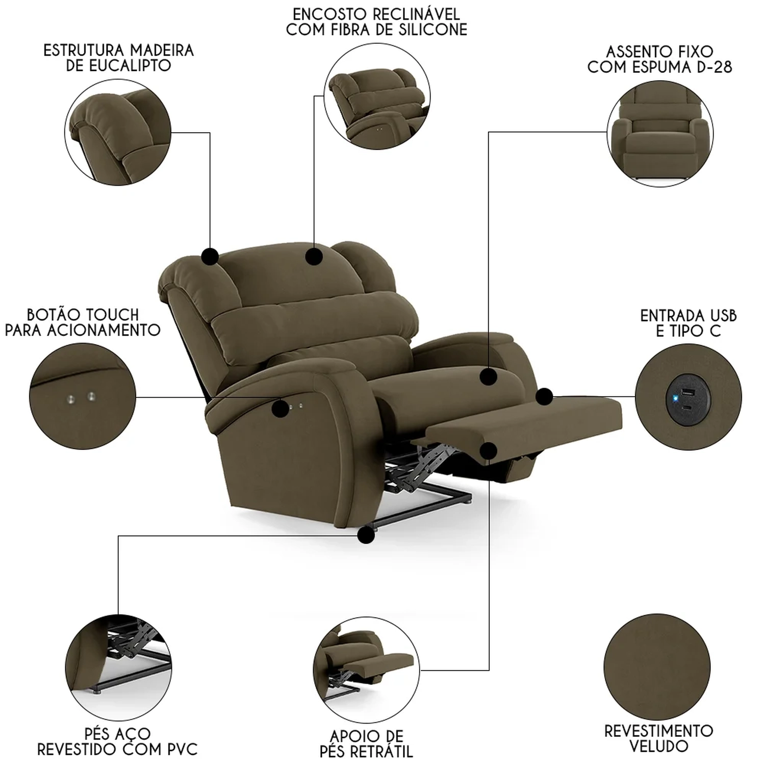 Com um design que alia modernidade e elegância, a Poltrona Reclinável é a escolha perfeita para aqueles que não abrem mão do conforto supremo. Seja mergulhando nas páginas de um bom livro ou se deliciando com seus filmes e séries prediletos, esta Poltrona Do Papai promete ser o seu refúgio particular. A facilidade de ajuste com o botão elétrico permite que você encontre a posição perfeita com o toque suave de um botão touch. Ah! E ela ainda conta com entrada USB e tipo C ideal para carregar seus eletrônicos enquanto descansa, tudo pensado para proporcionar uma experiência imersiva sem igual. E não é só sobre conforto, mas também sobre durabilidade e estilo, como a madeira maciça de eucalipto e o revestimento de alta qualidade. As dimensões generosas garantem que você tenha espaço de sobra para relaxar, enquanto a capacidade de suportar até 110kg assegura que é uma peça robusta e confiável. Não é apenas uma poltrona, é um upgrade na sua qualidade de vida, trazendo o glamour do cinema diretamente para o seu lar.