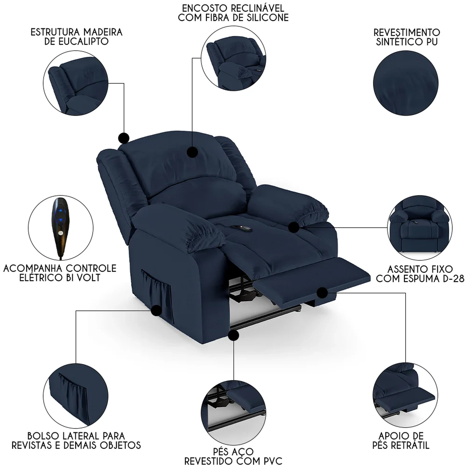 Imagine transformar sua Sala De Estar em um espaço de entretenimento de última geração com a Poltrona do Papai Reclinável Pietra Controle Power Elétrico FH9 Sintético PU Azul, da Mpozenato!