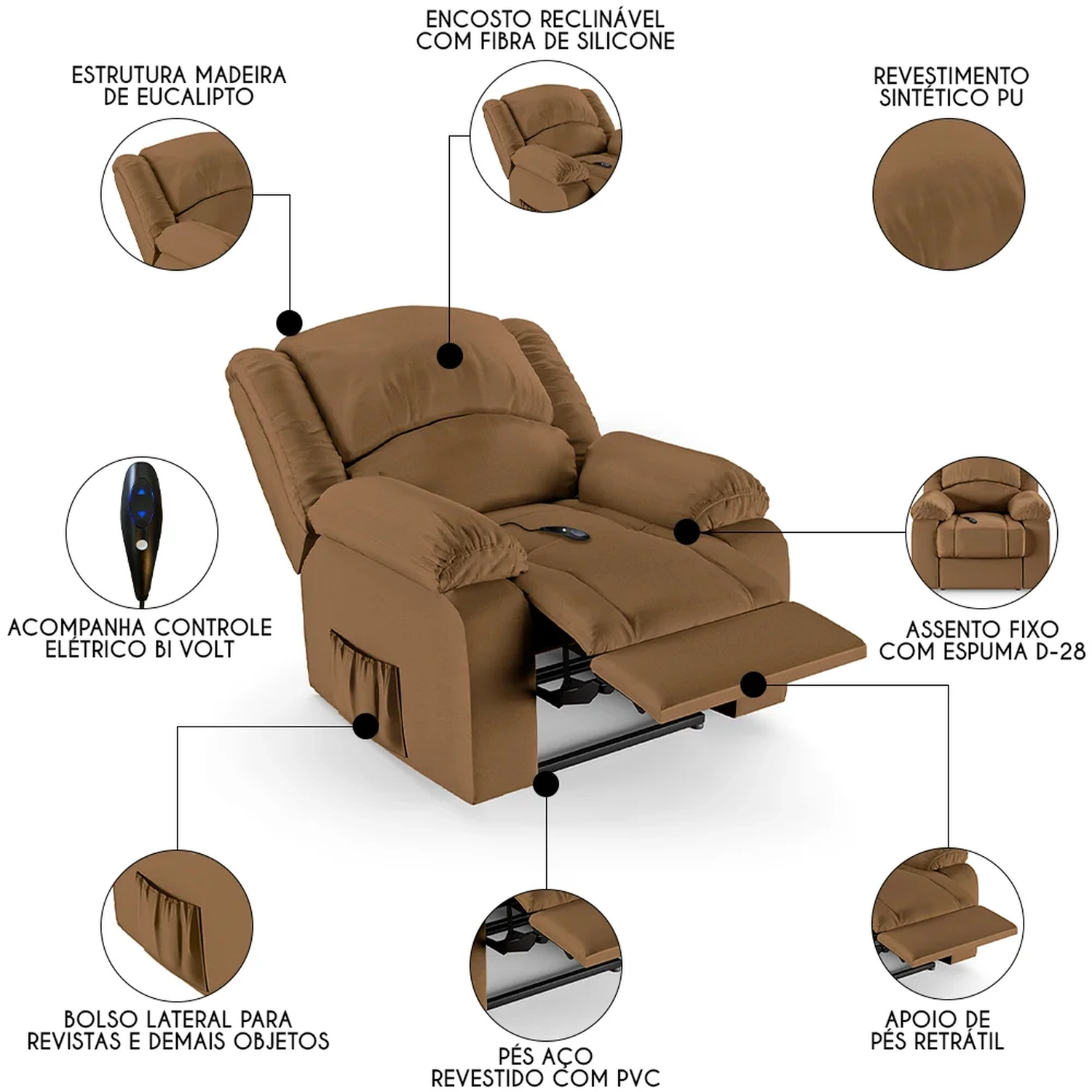 Imagine transformar sua Sala De Estar em um espaço de entretenimento de última geração com a Poltrona do Papai Reclinável Pietra Controle Power Elétrico FH9 Sintético PU Caramelo, da Mpozenato!