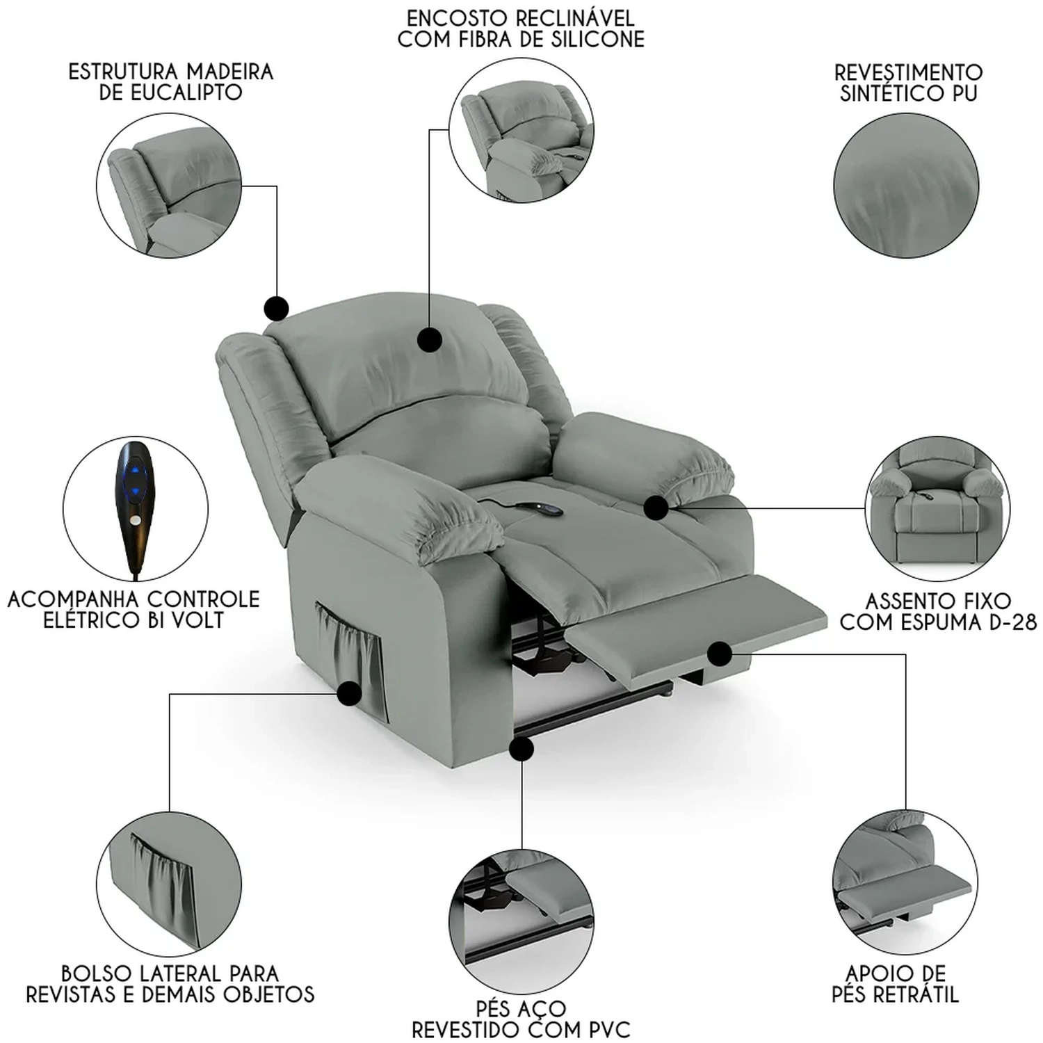 Imagine transformar sua Sala De Estar em um espaço de entretenimento de última geração com a Poltrona do Papai Reclinável Pietra Controle Power Elétrico FH9 Sintético PU Cinza, da Mpozenato!