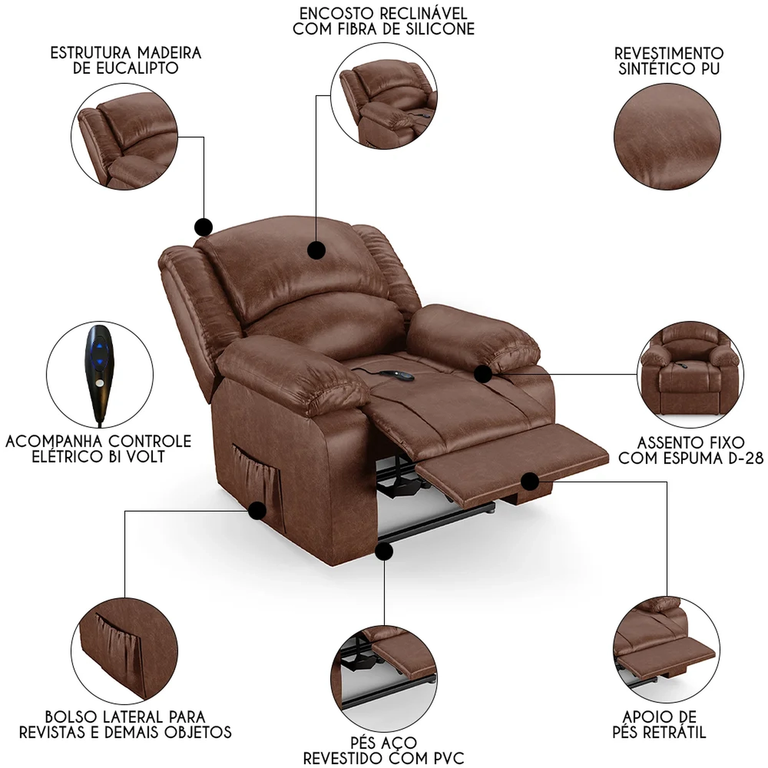 Imagine transformar sua Sala De Estar em um espaço de entretenimento de última geração com a Poltrona do Papai Reclinável Pietra Controle Power Elétrico FH9 Sintético PU Marrom Brilho, da Mpozenato!