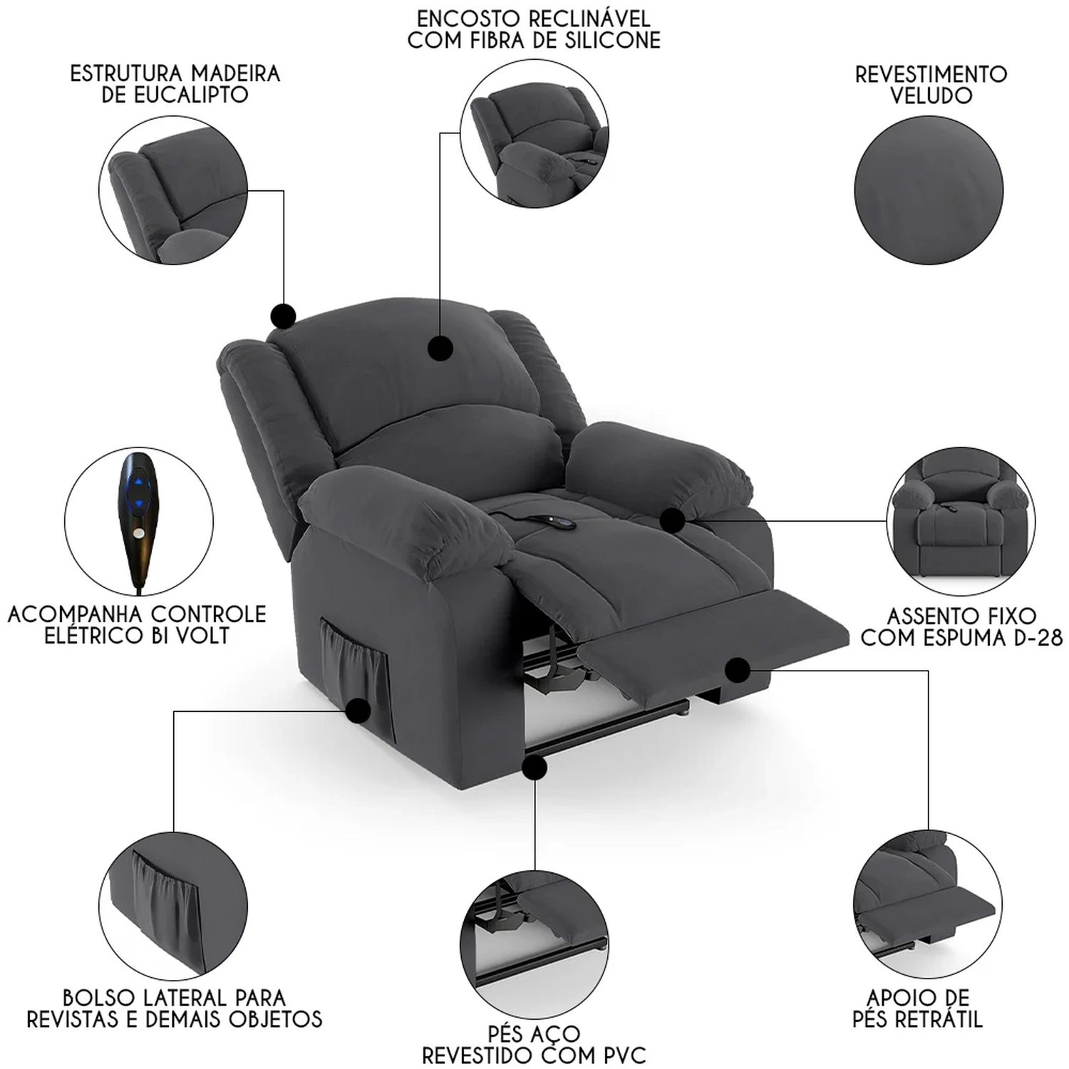 Imagine transformar sua Sala De Estar em um espaço de entretenimento de última geração com a Poltrona do Papai Reclinável Pietra Controle Power Elétrico FH9 Veludo Cinza, da Mpozenato!