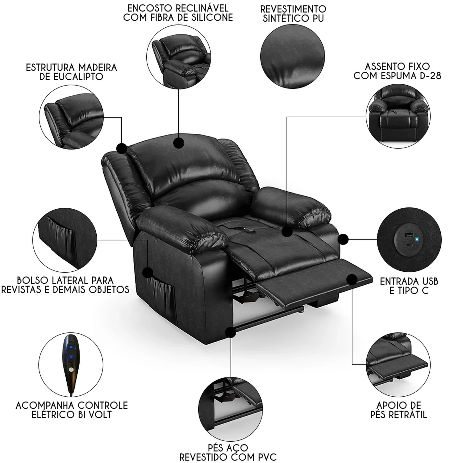 Imagine transformar sua Sala De Estar em um espaço de entretenimento de última geração com a Poltrona do Papai Reclinável Pietra Controle Power Elétrico USB FH9 PU Preto Brilho, da Mpozenato!