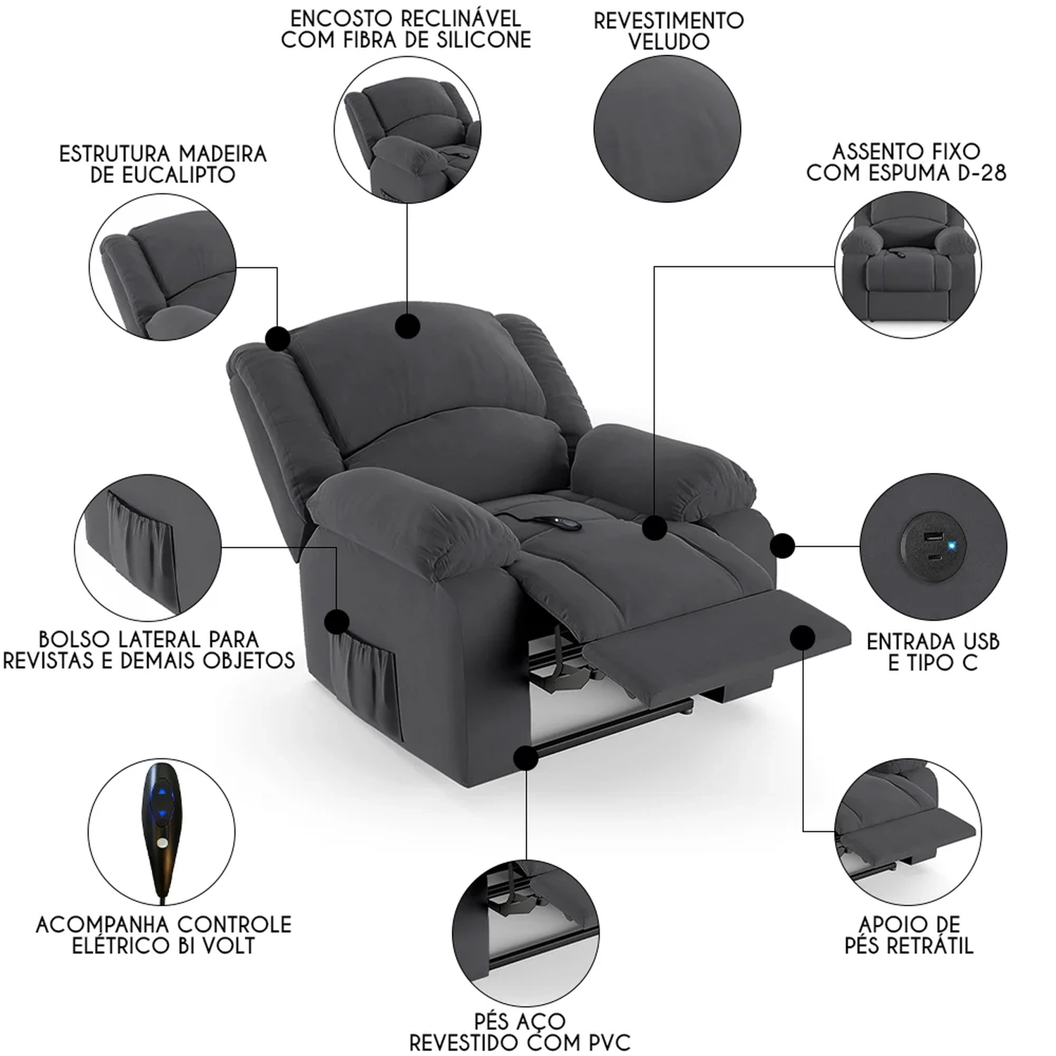 Imagine transformar sua Sala De Estar em um espaço de entretenimento de última geração com a Poltrona do Papai Reclinável Pietra Controle Power Elétrico USB FH9 Veludo Cinza, da Mpozenato!