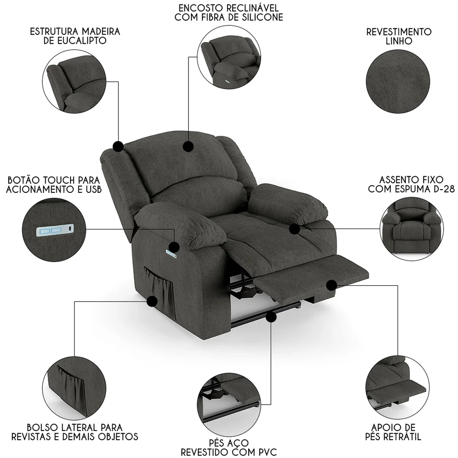 Hora de deixar a sua Sala De Estar mais moderna e transformar em um espaço de entretenimento de última geração com a Poltrona do Papai Reclinável Pietra Elétrica LED FH9 Linho Grafite, da Mpozenato!